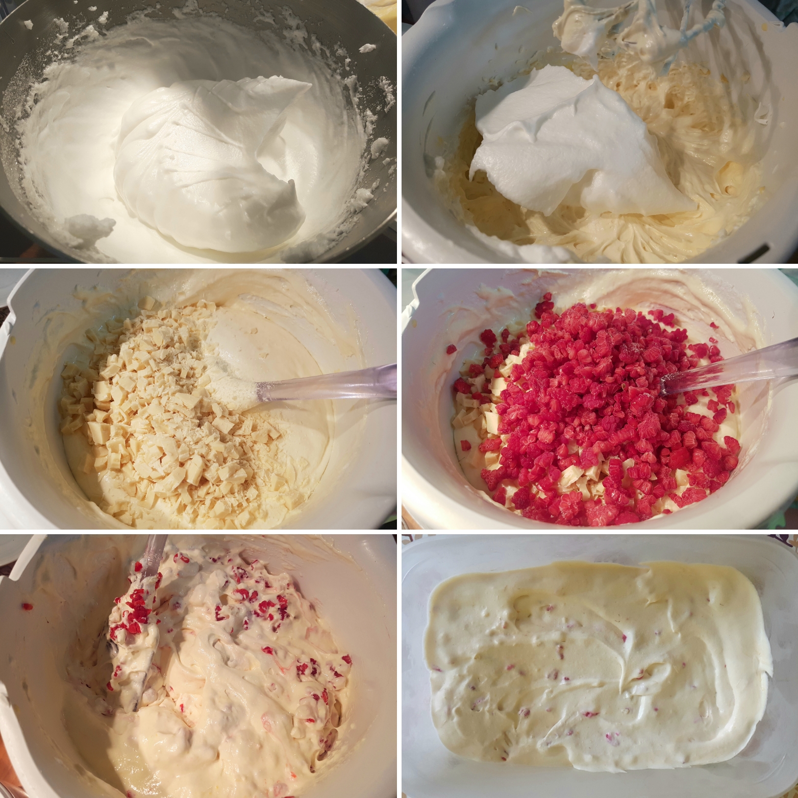 4. Preostalu belu čokoladu iseckajte na malene kockice, a smrznute maline izdrobite rukama, te umešajte u sladolednu smesu.