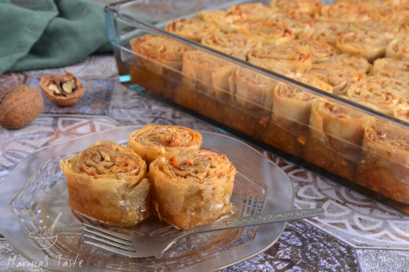 Iako sam uglavnom ispoštovala original smanjila sam malo količinu oraha, za rolnice sam koristila po dve kore a naknadno sam bila dokuvala još malo sirupa jer volim kad je baklava sočnija. U receptu koji sledi navešću obe mere.