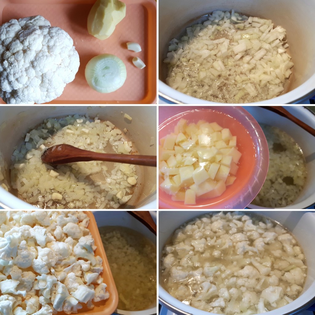 3. Oljuštite krompir i iseckajte ga na kockice, a karfiol iscepkajte na cvetiće, te dodajte povrće u ključalu vodu. Kuvajte dok ne omekne.