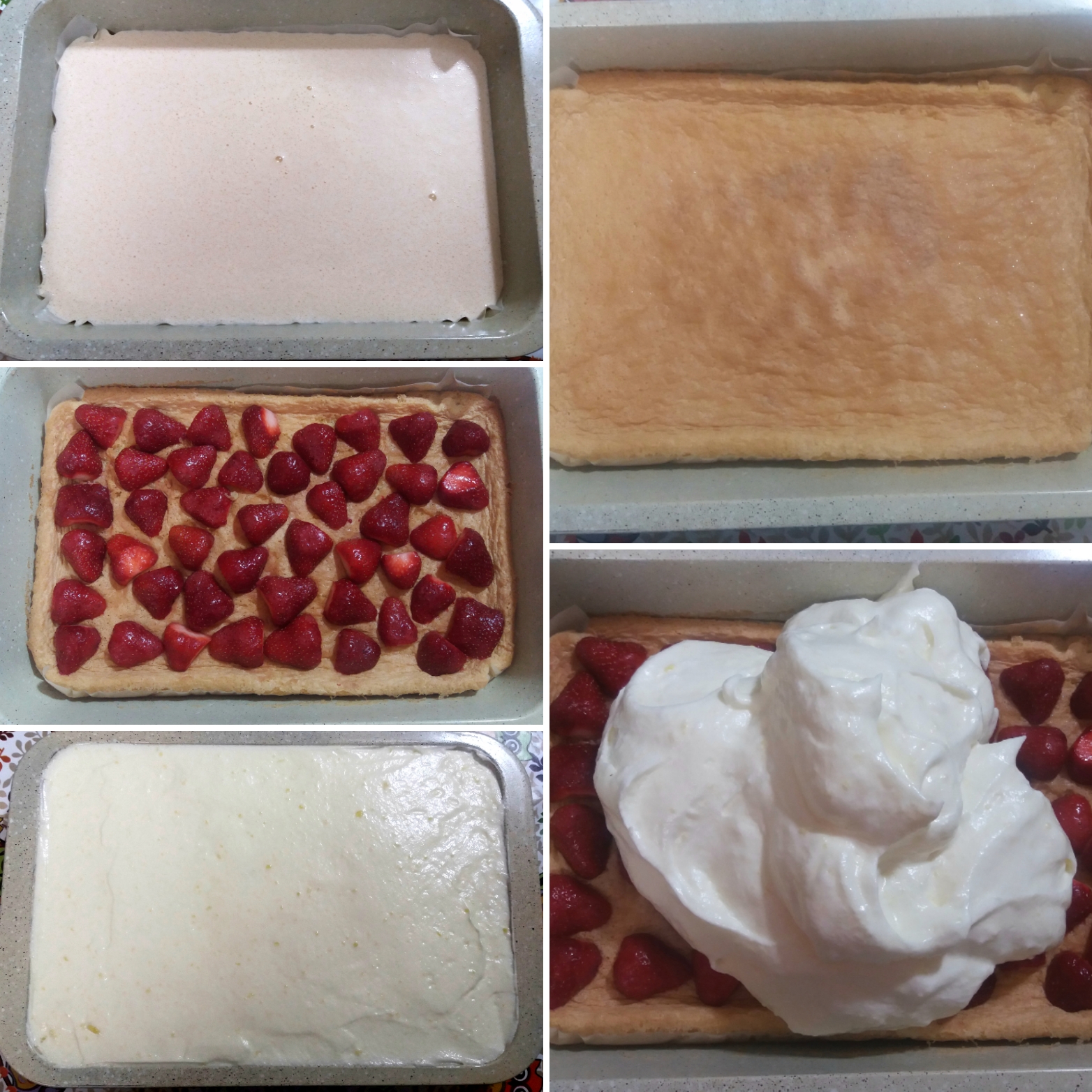 1. Na biskvitnu koru poređajte oprane i oceđene jagode, pa nanesite krem šam i poravnajte.