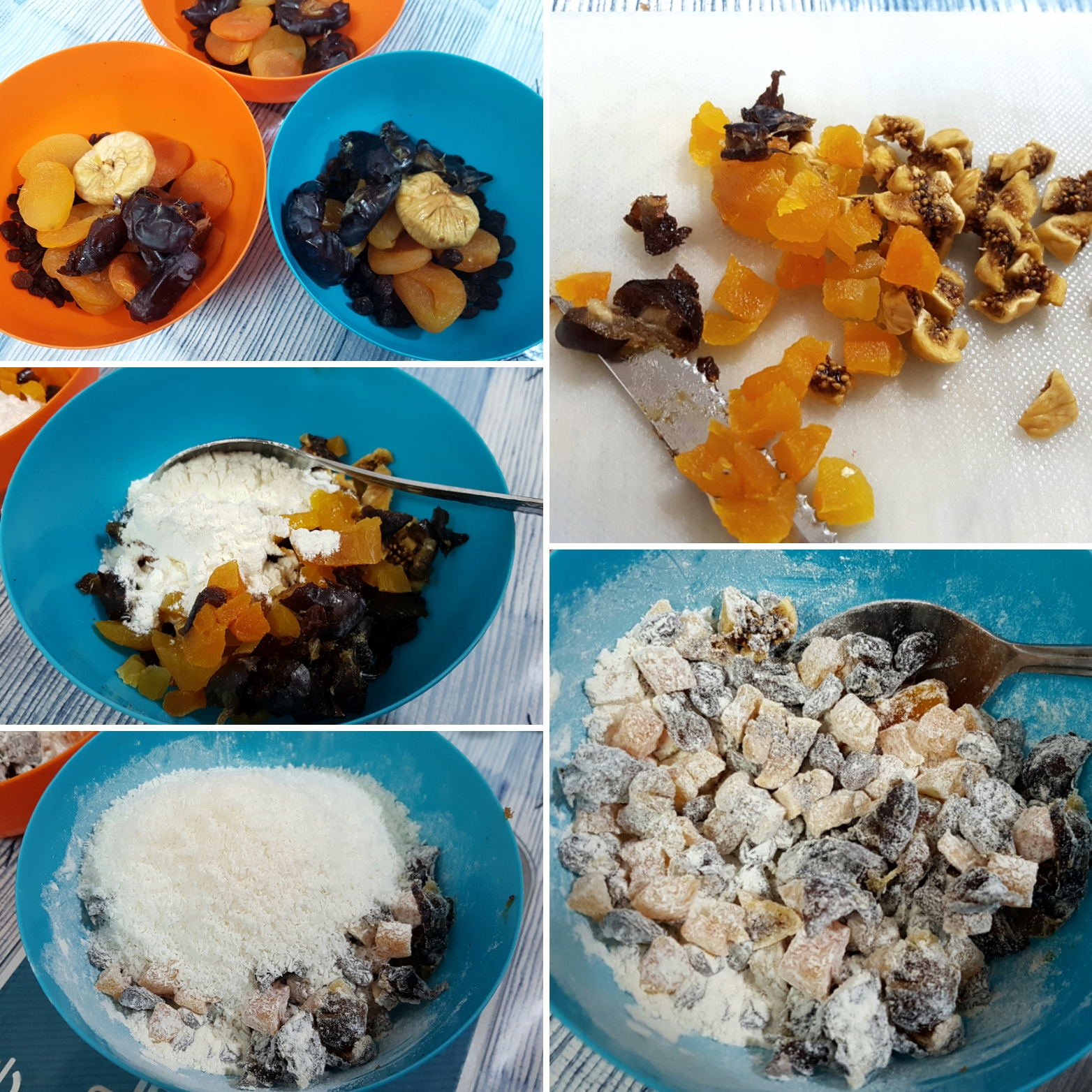 - Iseckajte suve kajsije, smokve i urme. Razmerite u tri činije po 50 g suvog grožđa i kajsija, po 25 g suvih smokava i urmi i po 50 g kokosa. Umešajte u svaku po 2 kašike brašna.