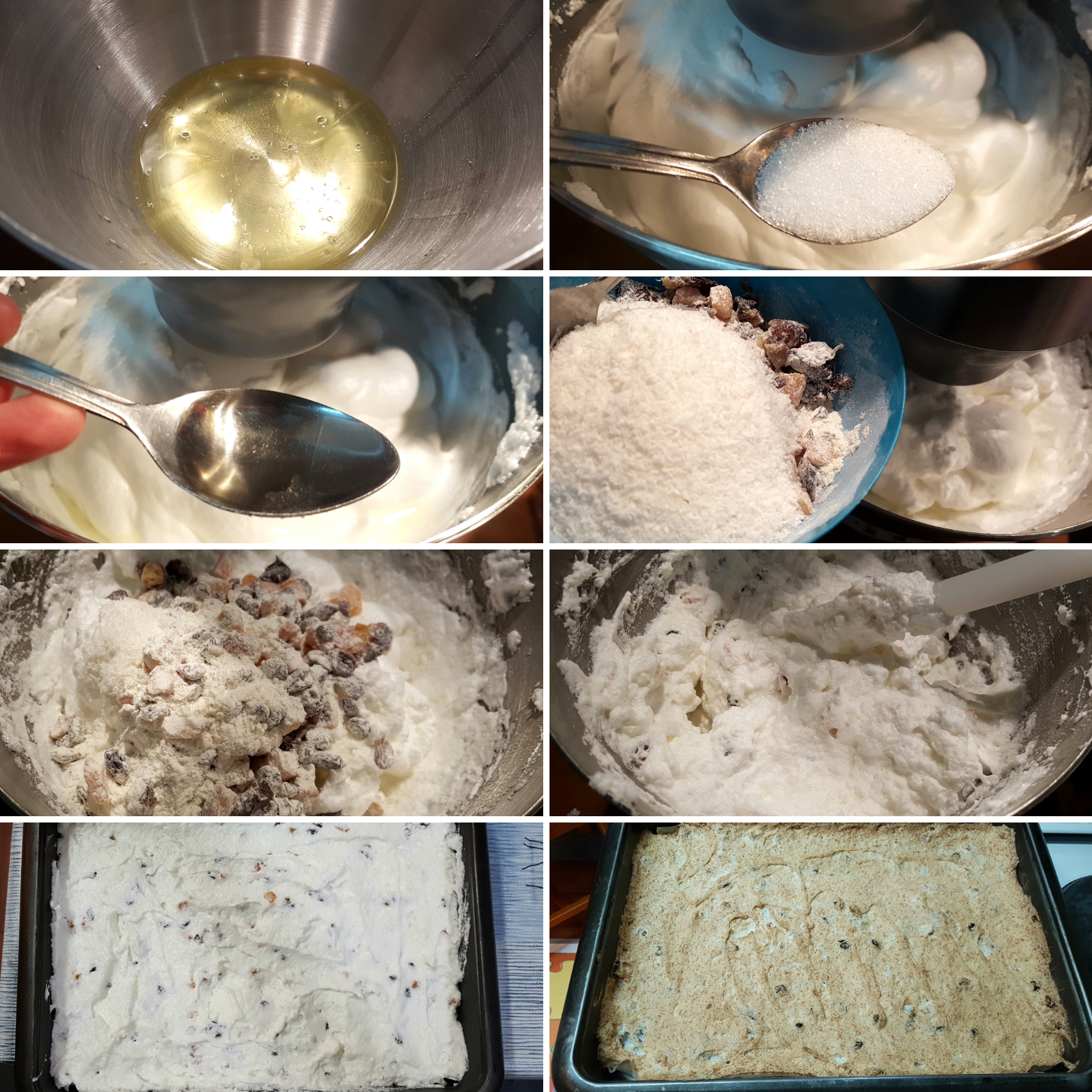 NAPOMENA: Opet da naglasim da suvo voće možete kombinovati po ukusu, a i količinski udeo svake vrste je proizvoljan, no bitno je da ukupno bude 150 g po kori. - Ulupajte 6 belanaca u čvrst šam, pa dodajte 6 kašika šećera i mutite dok se ne rastvori.