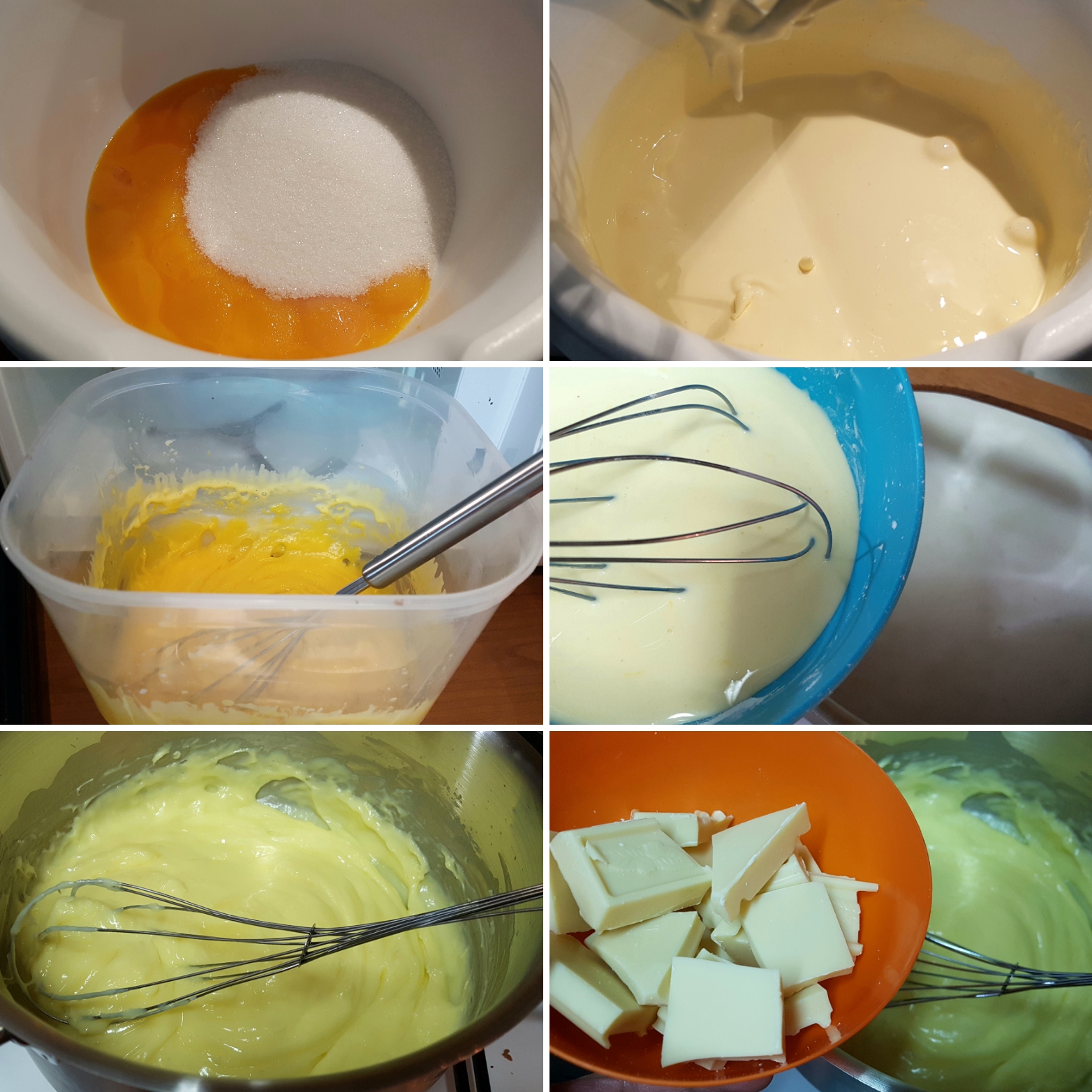 - Posebno zagrejte 5 dl mleka sa 150 g šećera, pa u proključalo umešajte prašak za puding rastvoren u preostalom mleku i kuvajte dok se ne zgusne. Dodajte kockice bele čokolade i mešajte da se rastope.