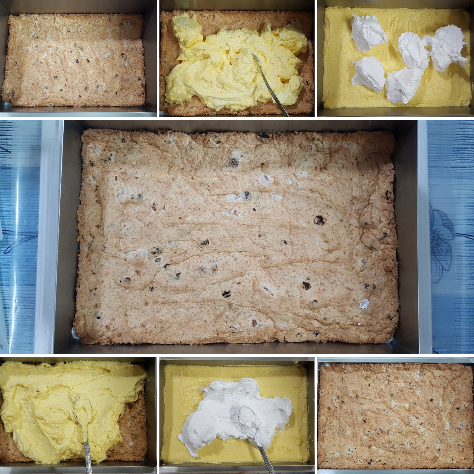 - Na prvu koru nanesite polovinu fila I, premažite slojem šlaga i prekrijte drugom korom.