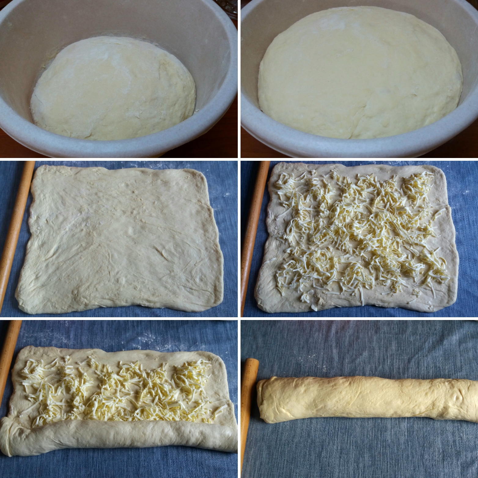 4. Razvijte oklagijom testo u pravougaonik, pospite celu površinu rendanim hladnim puterom il margarinom, pa urolajte. Dobijeni rolat poprečno isecite na 6-8 delova.