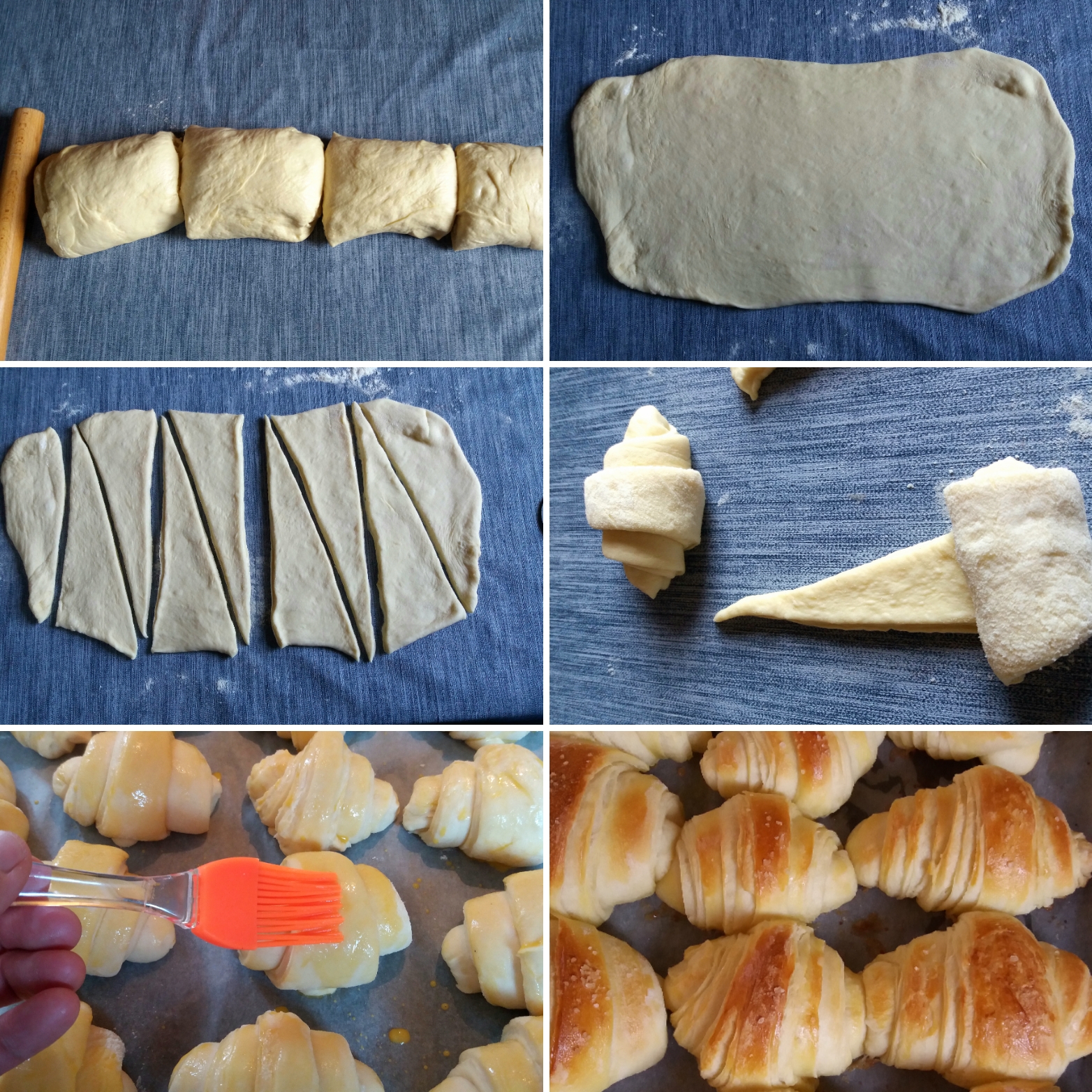 5. Svaki deo razvaljajte sad u manji pravougaonik , a potom isecite na trouglove. Svaki tako dobijen trougao savijte u kiflicu i ređajte u papirom za pečenje postavljen pleh.