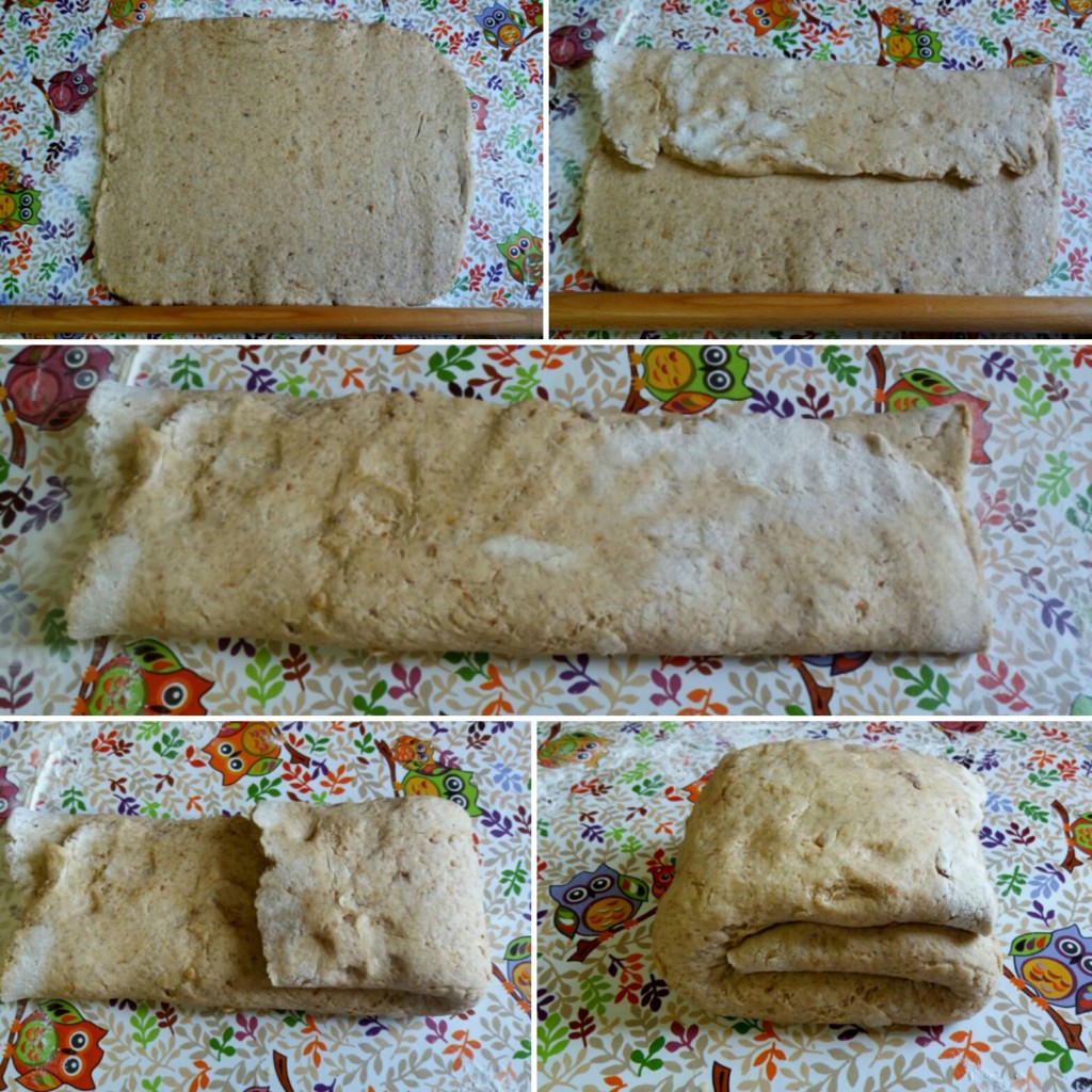 3. Razvijte oklagijom testo na debljinu od 1cm, preklopite ga od gore prema sredini, pa od dole ka sredini, a potom i sa obe strane prema unutra ( kao na slici iznad).
