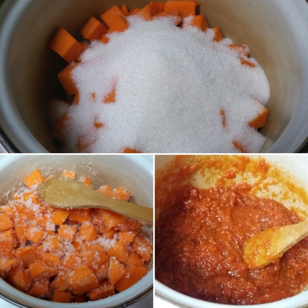1. Očistite bundevu od kore i semena , te naseckajte na kockice.Stavite u šerpu i dodajte šećer, a potom kuvajte uz povremeno mešanje dok tečnost koju bundeva pusti ne ispari. Dodajte cimet po ukusu i promešajte. Ostavite fil da se ohladi.