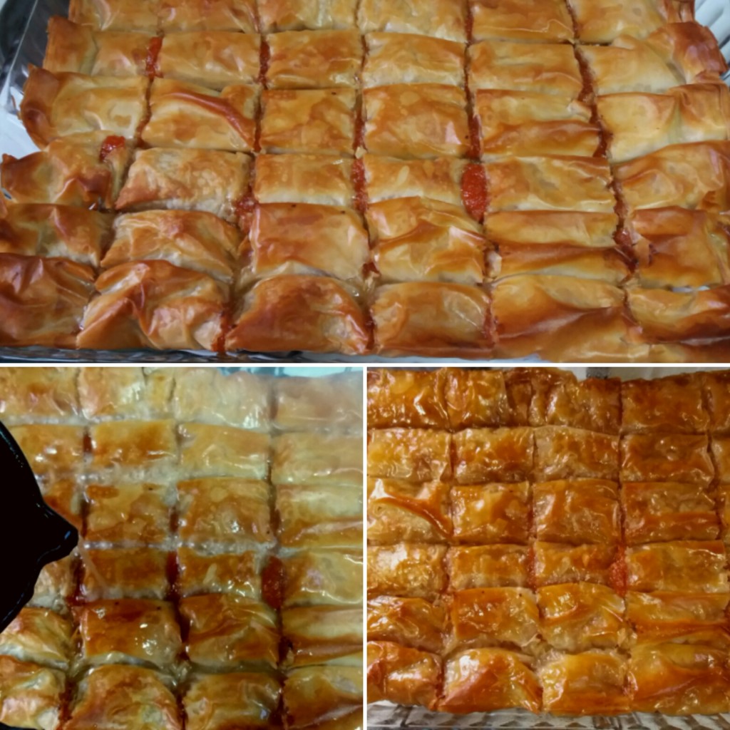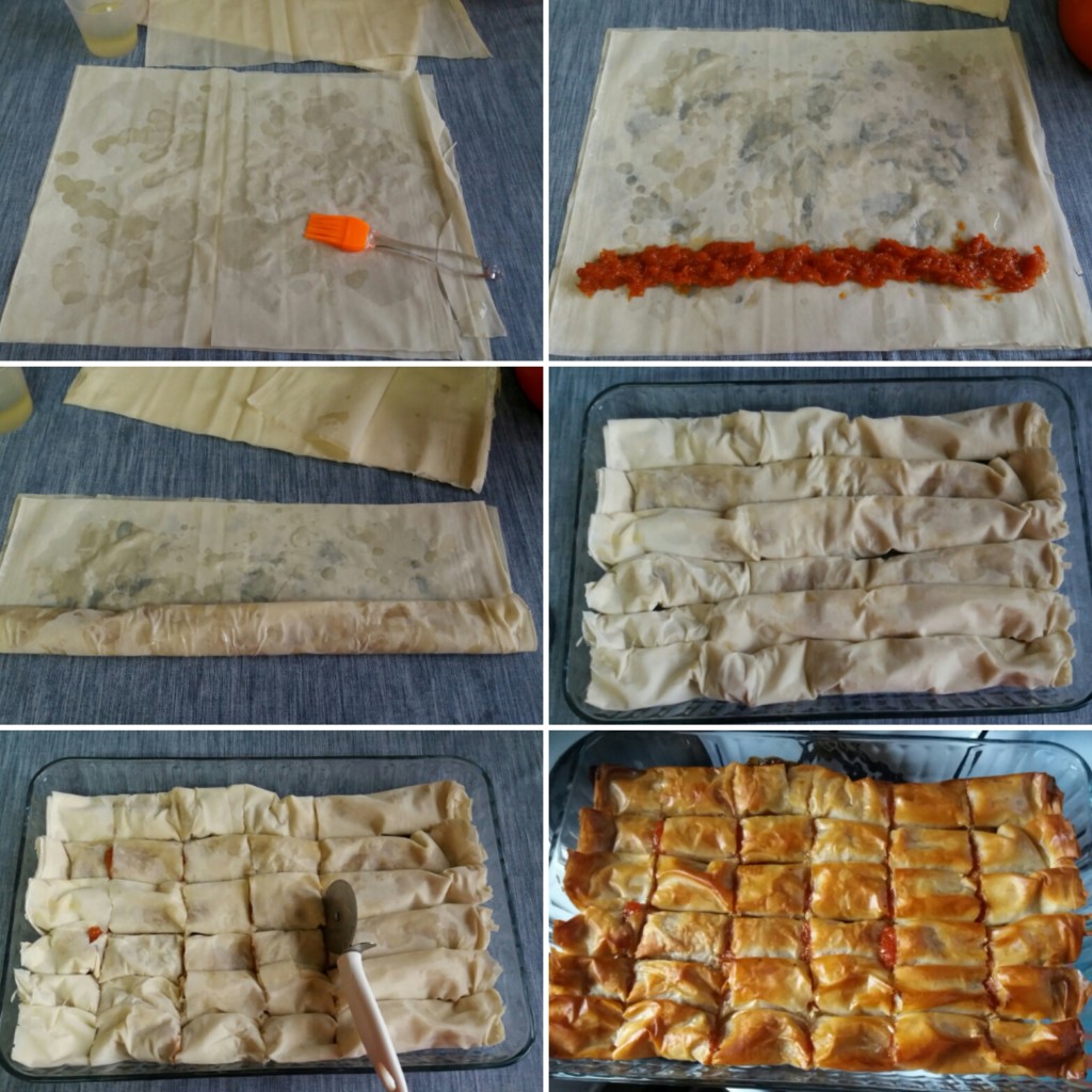 3. Postupak pripreme ponovite dok ne potrošite ostale kore i fil. Složene rolate isecite poprečno na komade željene dužine, pa stavite u rernu zagrejanu na 200 °C da se peku 30 minuta.