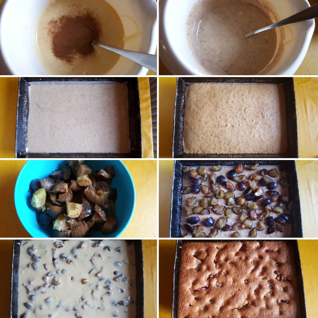 5. Izvadite iz rerne, rasporedite komadiće šljiva, zalijte preostalom biskvitnom smesom (bez cimeta) i vratite da se dopeče. Ukupno vreme pečenja zavisi od jačine rerne i kreće se u rasponu od 35-45 min. na temperaturi od 180 °C, a vi za svaki slučaj proverite čačkalicom (zabodete u testo i ako izađe suva, pečeno je).