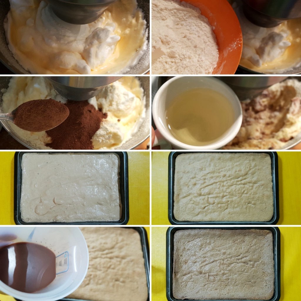 1. Ulupajte belanca u čvrst šam, pa dodajte šećer i miksajte dok se ne rastvori. Potom dodajte žumanca, ulje, kakao i brašno pomešano sa praškom za pecivo, te sve umutite.