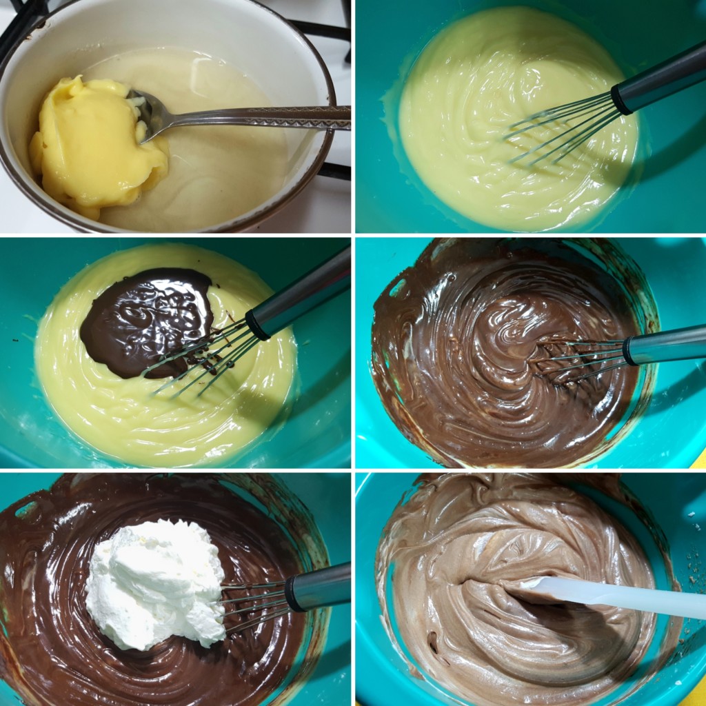 6. Ulupajte slatku pavlaku sa šećerom u prahu i dobijeni šlag dodajte u čokoladnu masu, lagano preklapajući špatulom.
