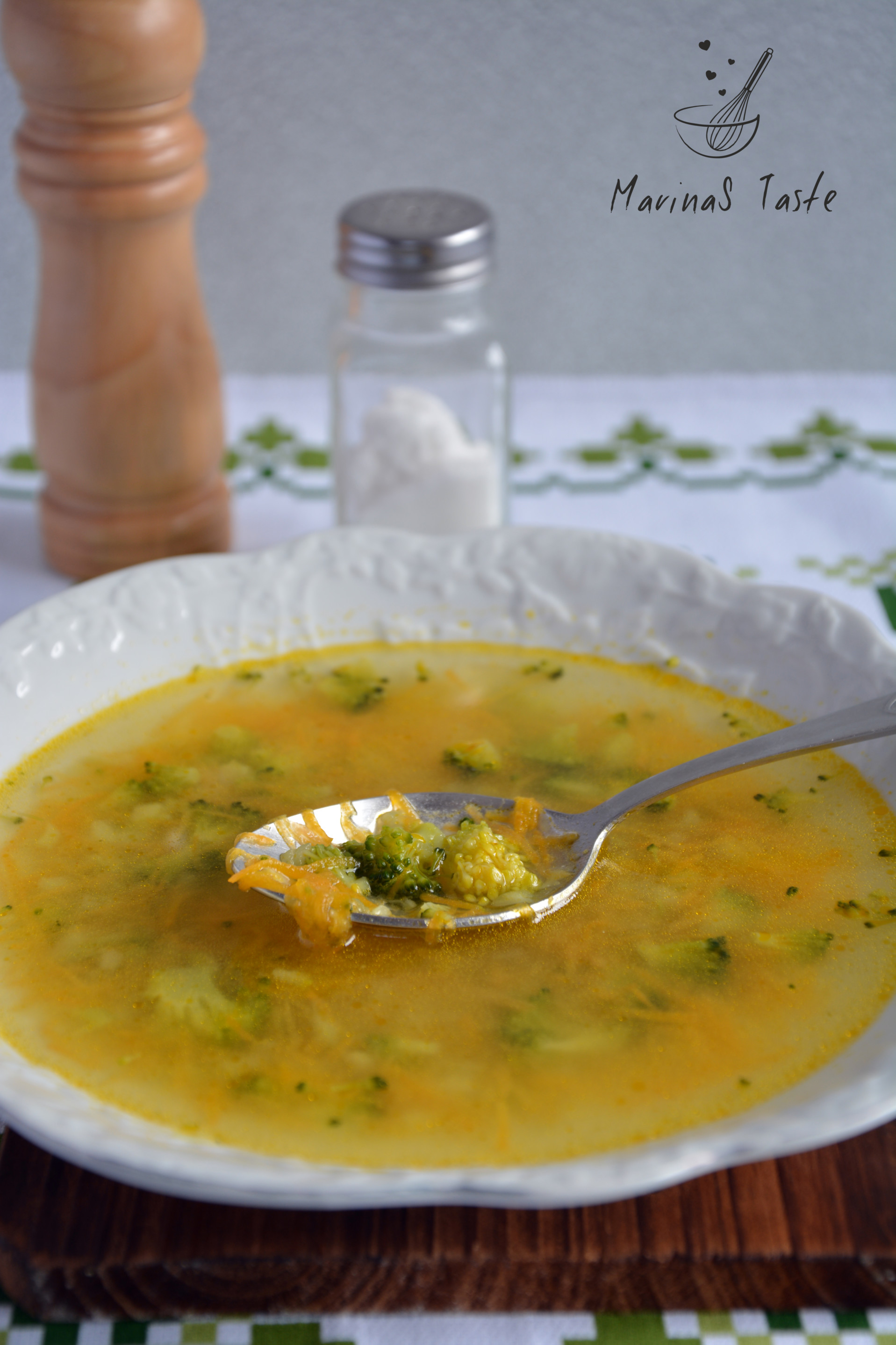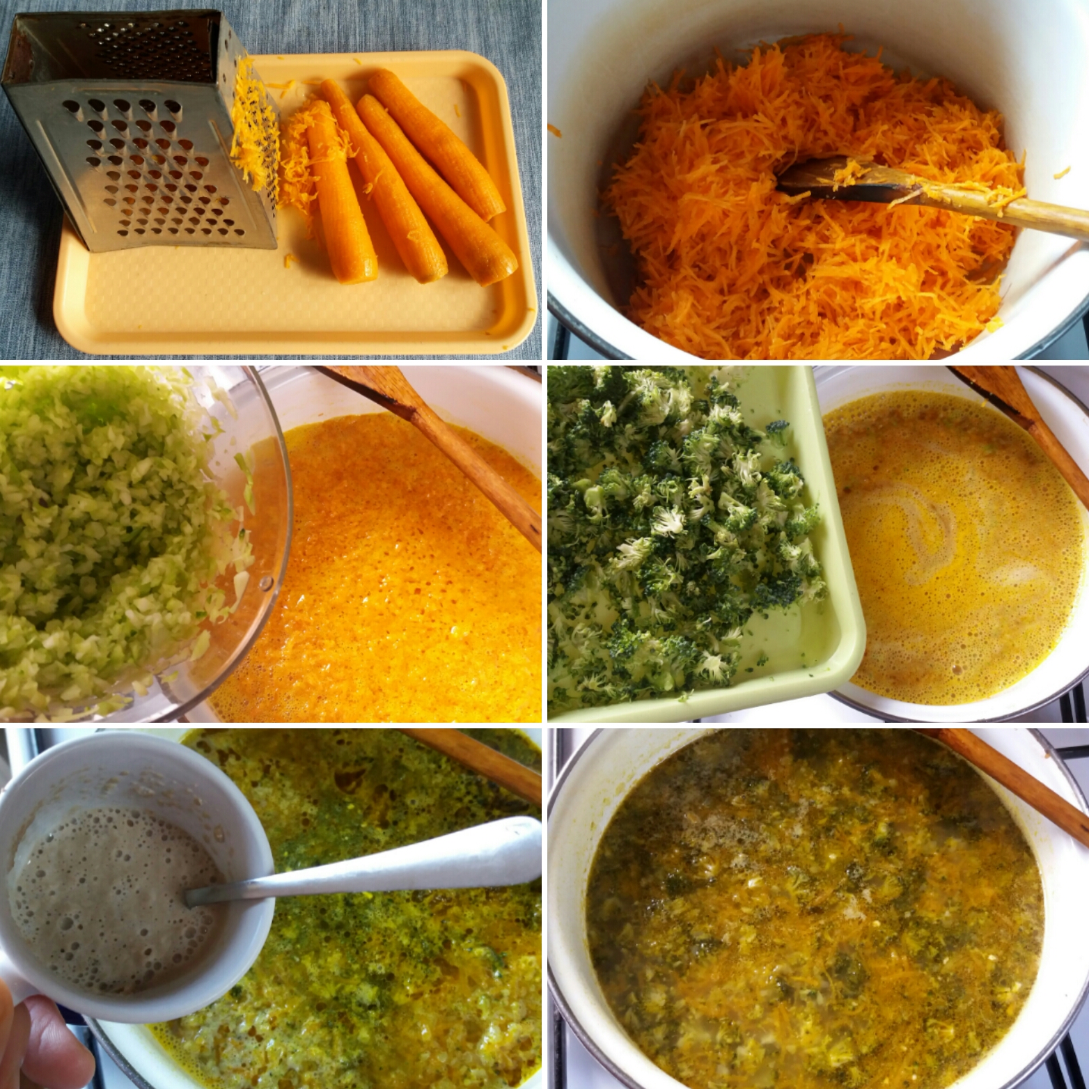 2. Na ulju propržite rendanu šargarepu tek toliko da omekne i otpusti boju (karotin) , a zatim nalijte vodom ( oko 1.5 l) i dodajte iseckano stablo brokolija. Kuvajte od momenta ključanja 10-15 min., pa dodajte i cvetiće.