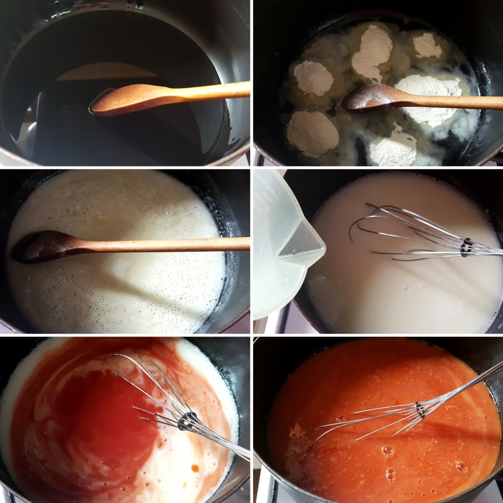 2. U šerpu sipajte ulje, zagrejte, te sipajte brašno i propržite kratko. Nalijte vrućom vodom i mešajte žicom da se ne naprave grudvice.