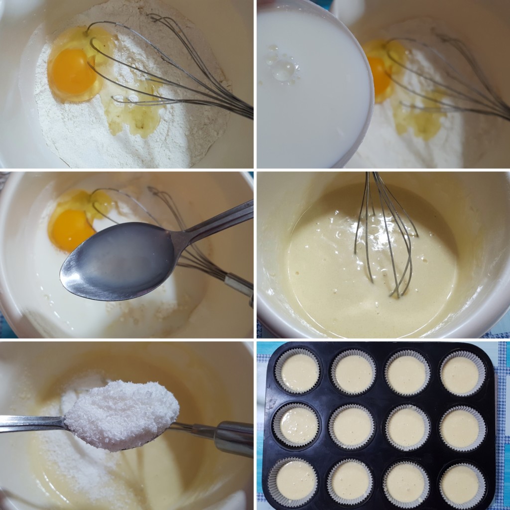 2. Umešajte kokos, a zatim manjom kutlačom rasporedite pripremljenu smesu u papirnim korpicama postavljene otvore kalupa za mafine.