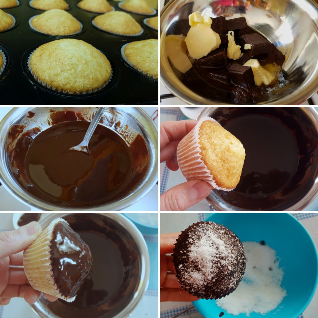 5. Gornju površinu kolača uronite prvo u glazuru, malo ocedite, pa pospite kokosom.