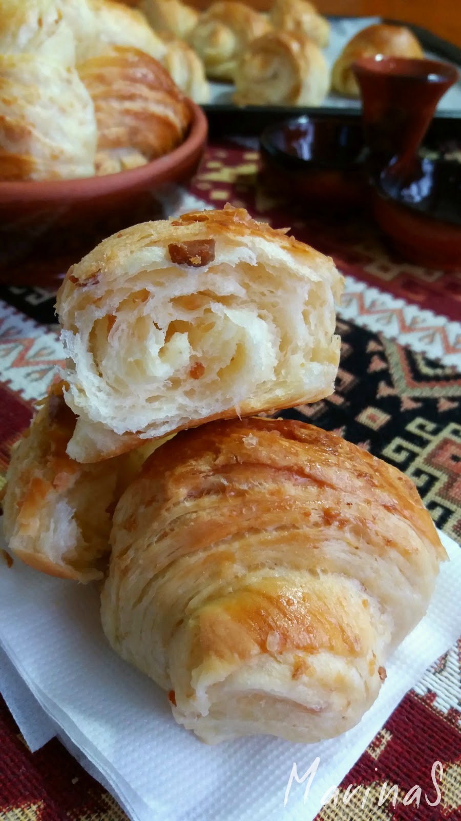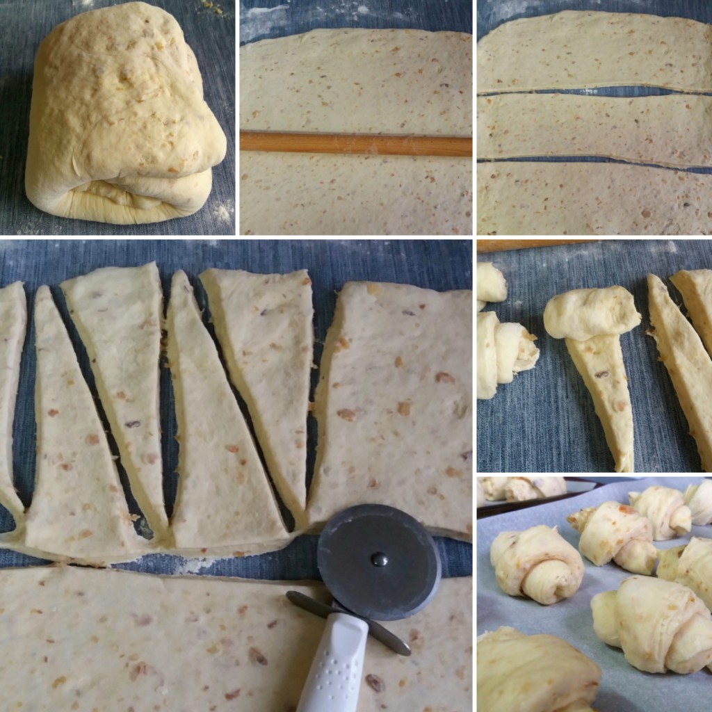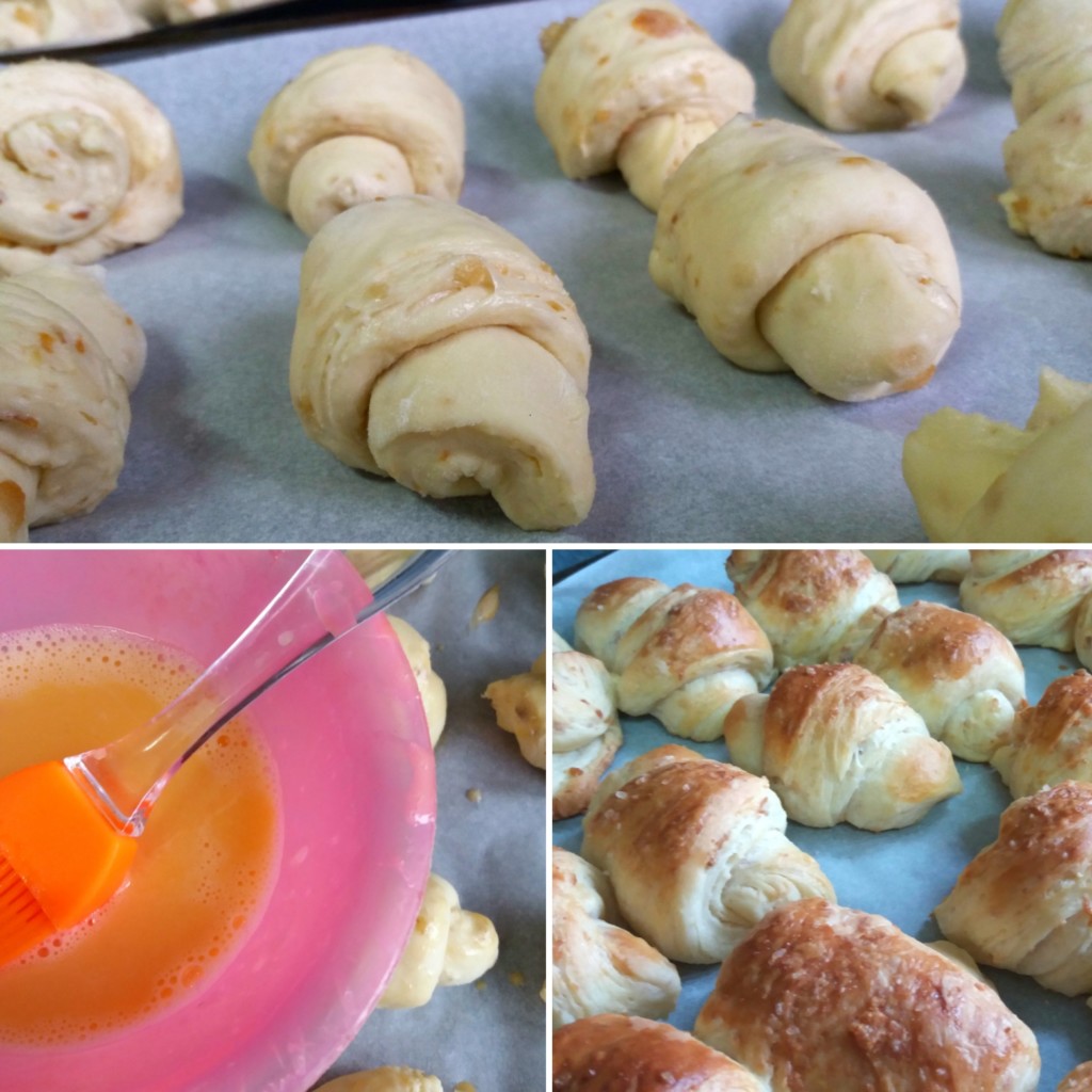 5. Razvijte testo tanje , te ga isecite na trouglove i savijajte kiflice. Ređajte ih u papirom za pečenje postavljen pleh i kad odstoje pola sata premažite ih razmućenim jajaetom i pospite krupnom solju.