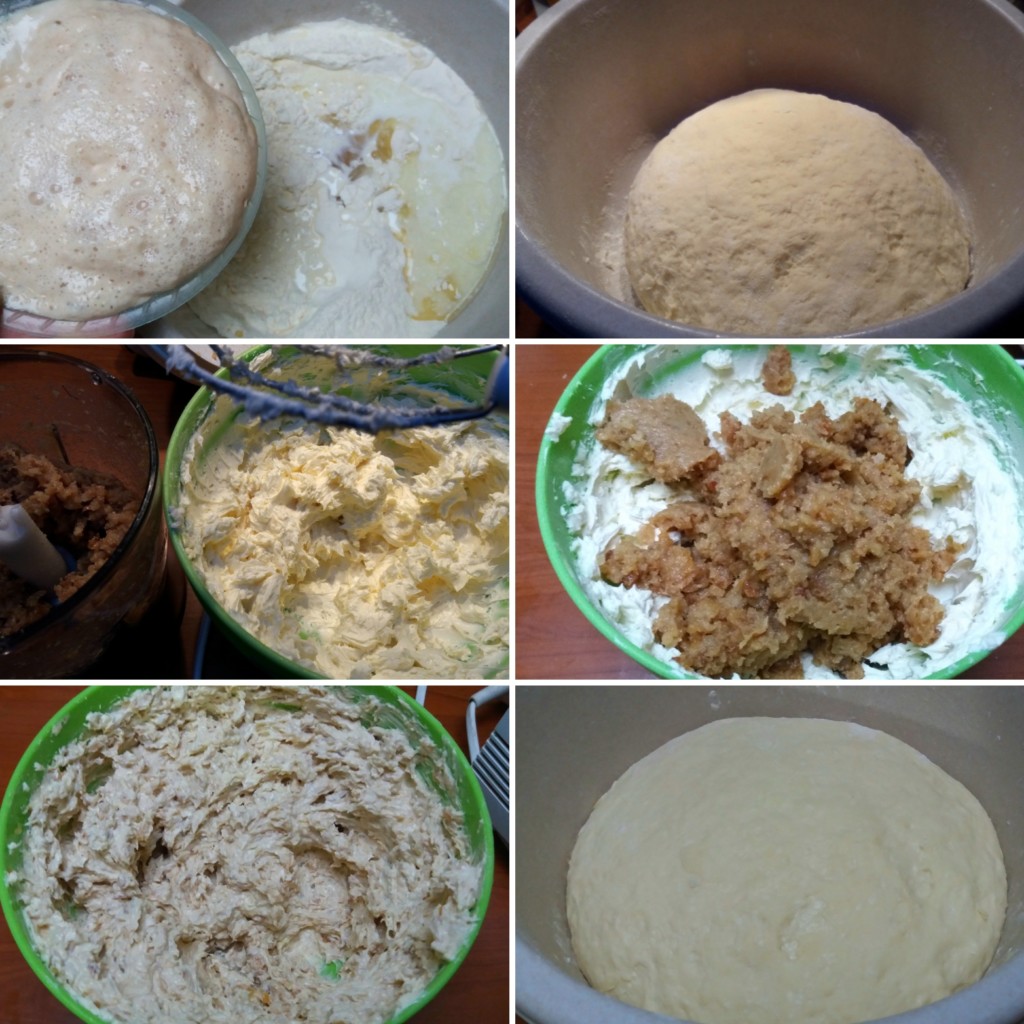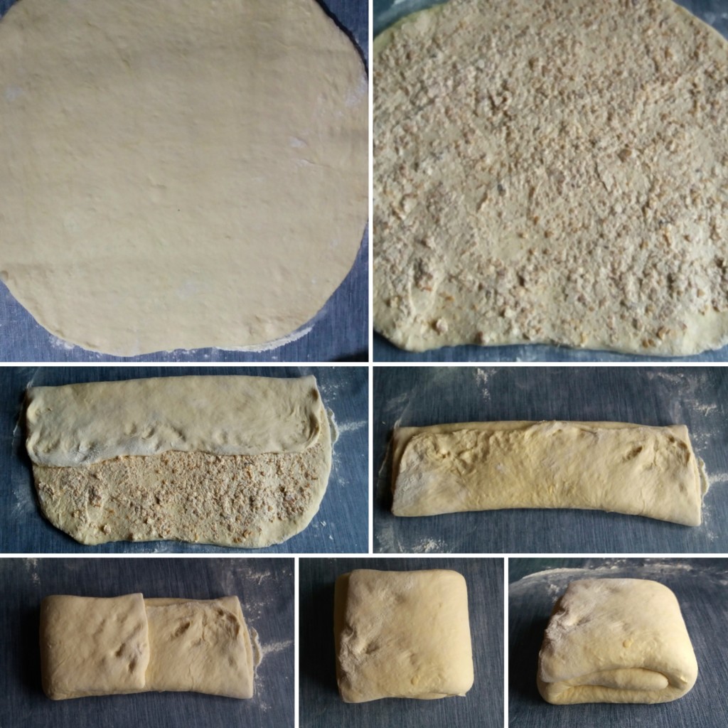 4. Razvijte oklagijom nadošlo testo na debljinu od 1 cm , premažite polovinom nadeva i savijte kao knjigu ( pogledaje postupak na slici). Ostavite pokriveno da odmori, a potom ponovite razvijanje, premazivanje i presavijanje još dva puta ( treći put bez premazivanja).