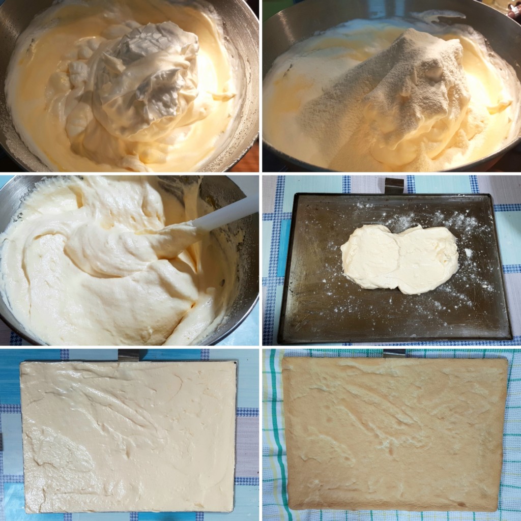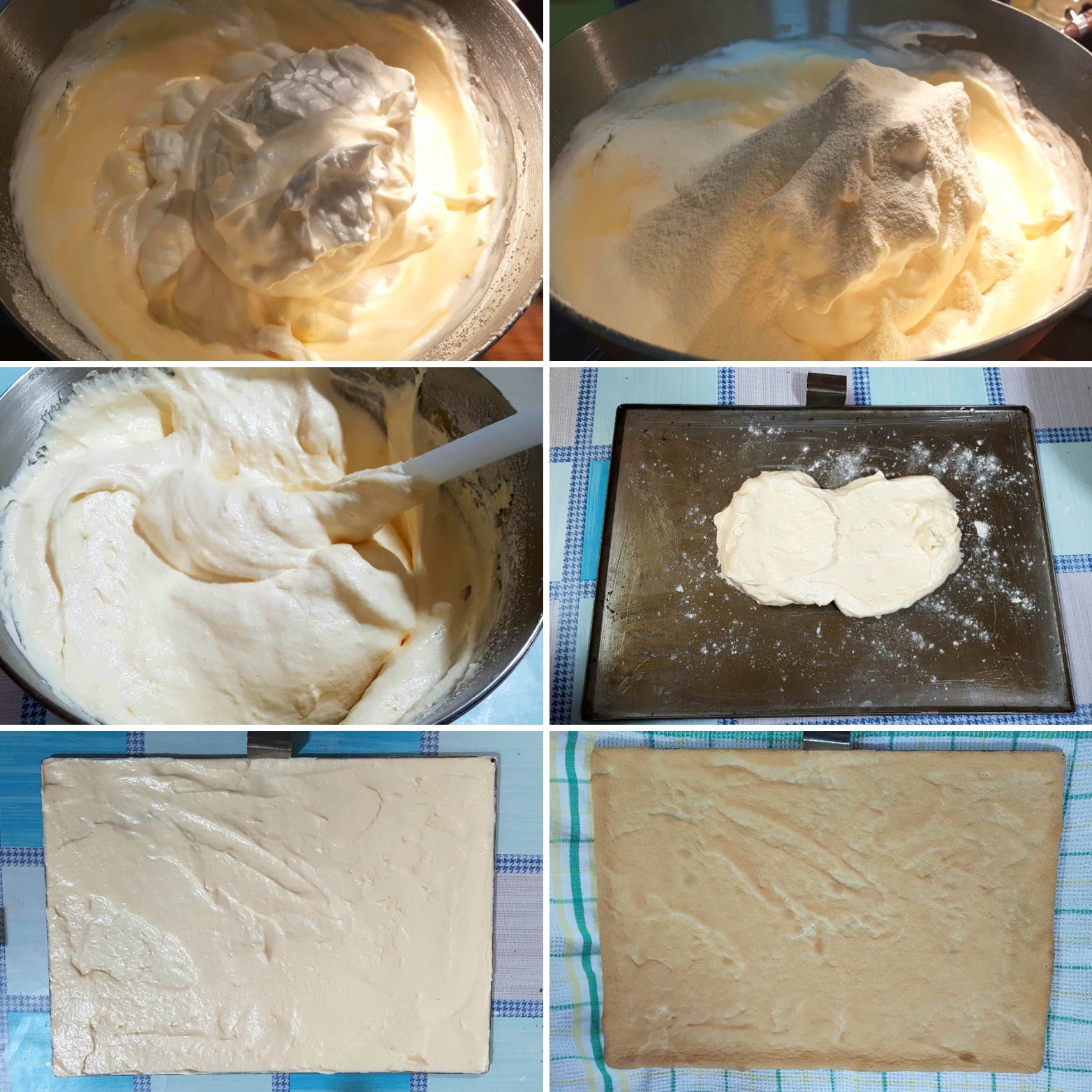 2. Pleh za doboš tortu ili poleđinu običnog pravougaonog pleha podmažite i pospite brašnom. Sipajte par kutlača smese , velikim nožem ili špatulom rasporedite ravnomerno po celoj površini i pecite u rerni zagrejanoj na 180 ° C dok ne porumeni (oko 8-12 min.).