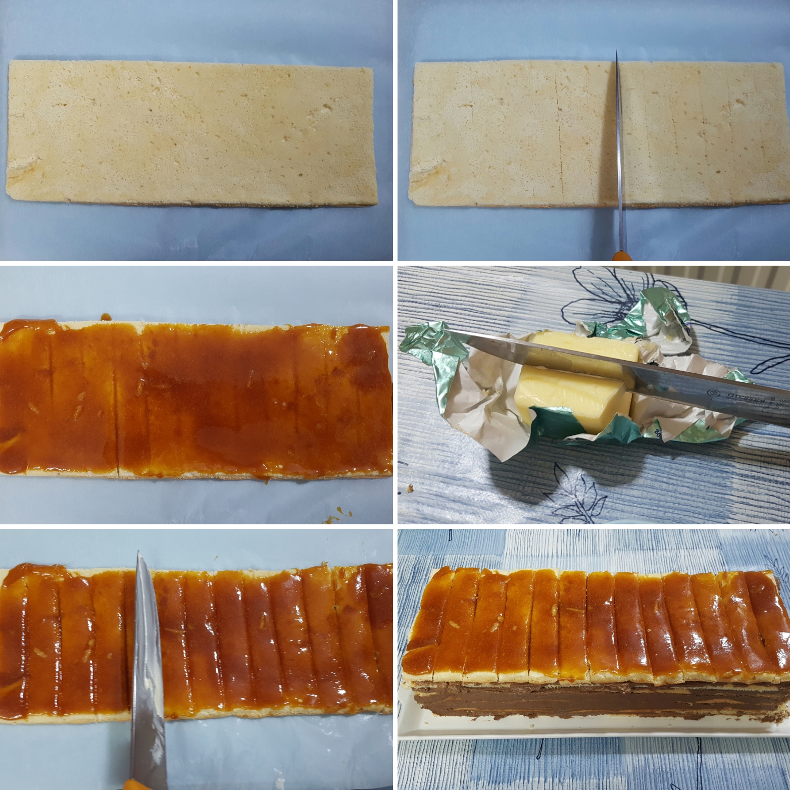 NAPOMENA: Možete i do kraja iseći komade, pa ih poređati po kremu. Kad se pravi okrugla torta često se ti karamel trouglovi ređaju ukoso i u krug , širim krajem oslonjeni na pufnu krema.