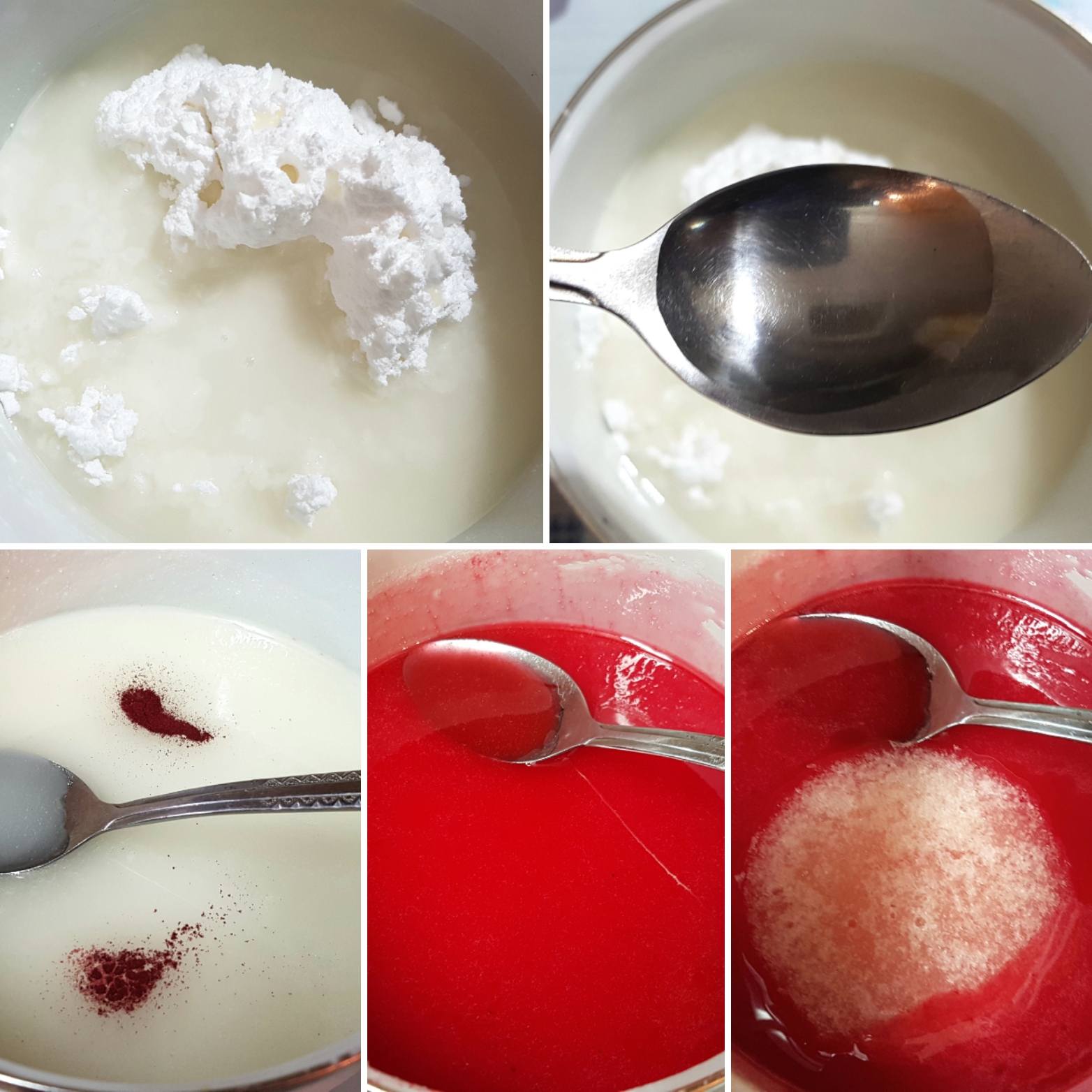 2. U šerpicu stavite šećer u prahu, vodu, ružinu vodu i glukozni sirup ili med, pa zagrevajte dok se sve lepo ne sjedini. Dodajte malo boje u prahu, a potom sklonite s vatre i umešajte želatin da se rastopi.