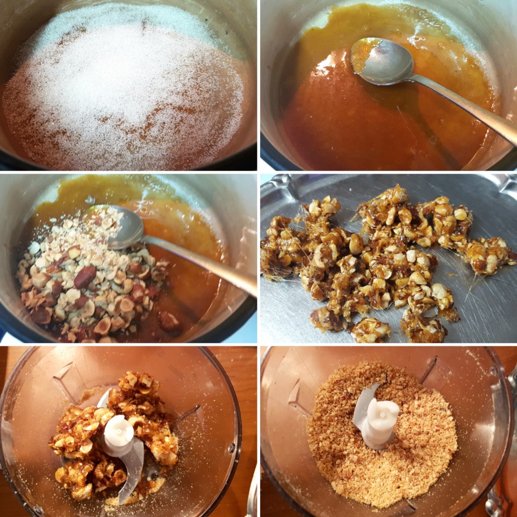 1. U šerpi na tihoj vatri rastopite šećer u karamel, pa dodajte lešnike, promešajte i istresite na nauljenu tacnu.