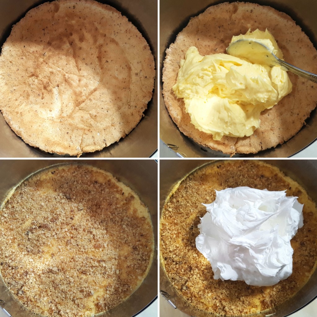 NAPOMENA: Na fotografijama pripreme vidi se da sam grilijašem posipala i sam fil I, ali se verovatno zbog mleka u sastavu karamel malo topio vremenom, pa ako želite deo grilijaša možete da umešate u fil II (šlag), a delom ga pospite od gore.