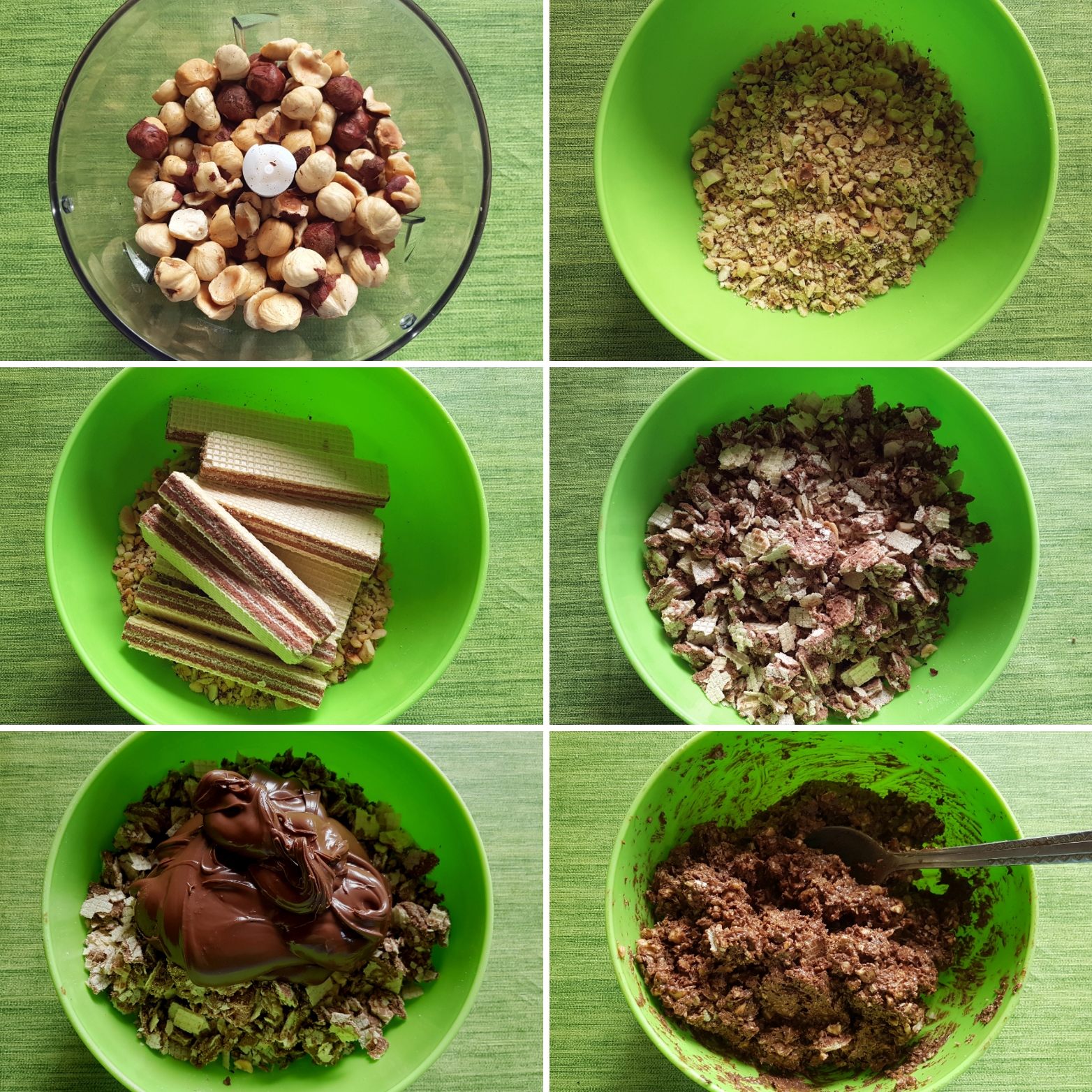 - Pečene lešnike usitnite u secku,a napolitanke izdrobite rukama.