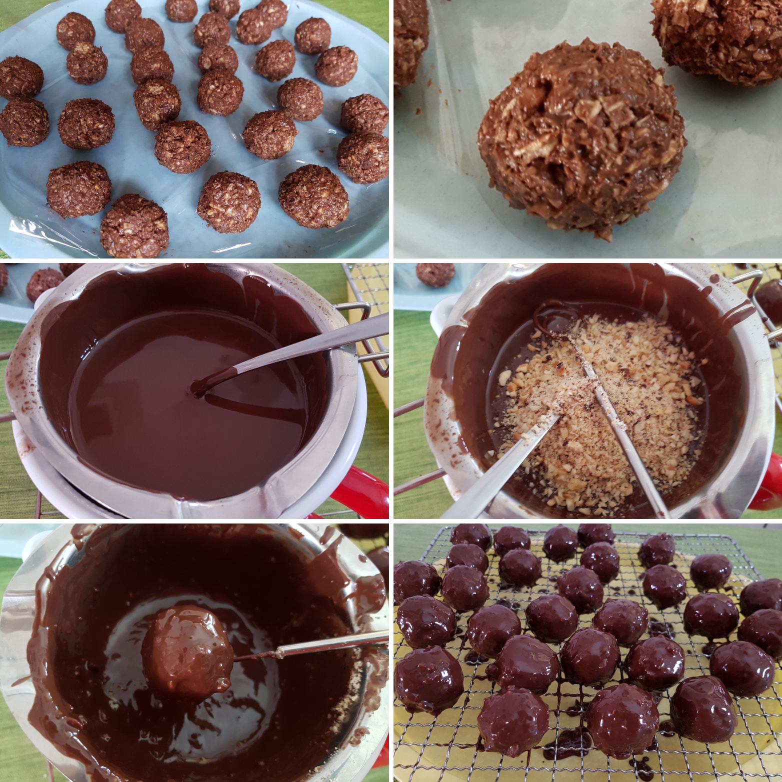 - U sudu na pari rastopite čokoladu sa uljem.Možete u nju da umešate i sekane lešnike kako bi dobili karakterističan ferero izgled. Kuglice potapajte i vadite na rešetku da se višak čokolade slije i ocedi.