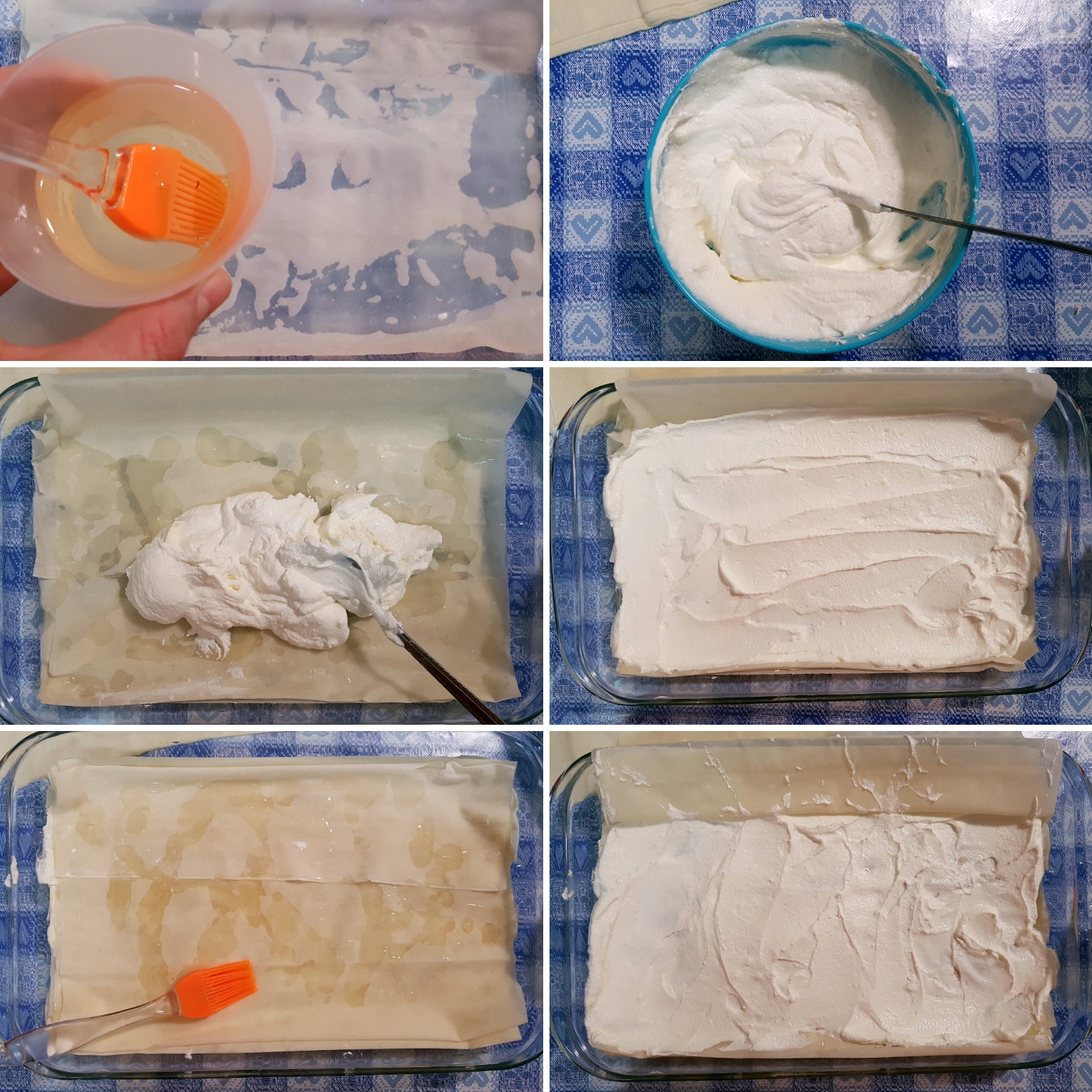 3. Rasporedite polovinu nadeva, pa poređajte drugu trećinu kora, a svaku od njih takođe poškropite uljem. Nanesite preostali nadev, pa na isti način složite ostatak kora.