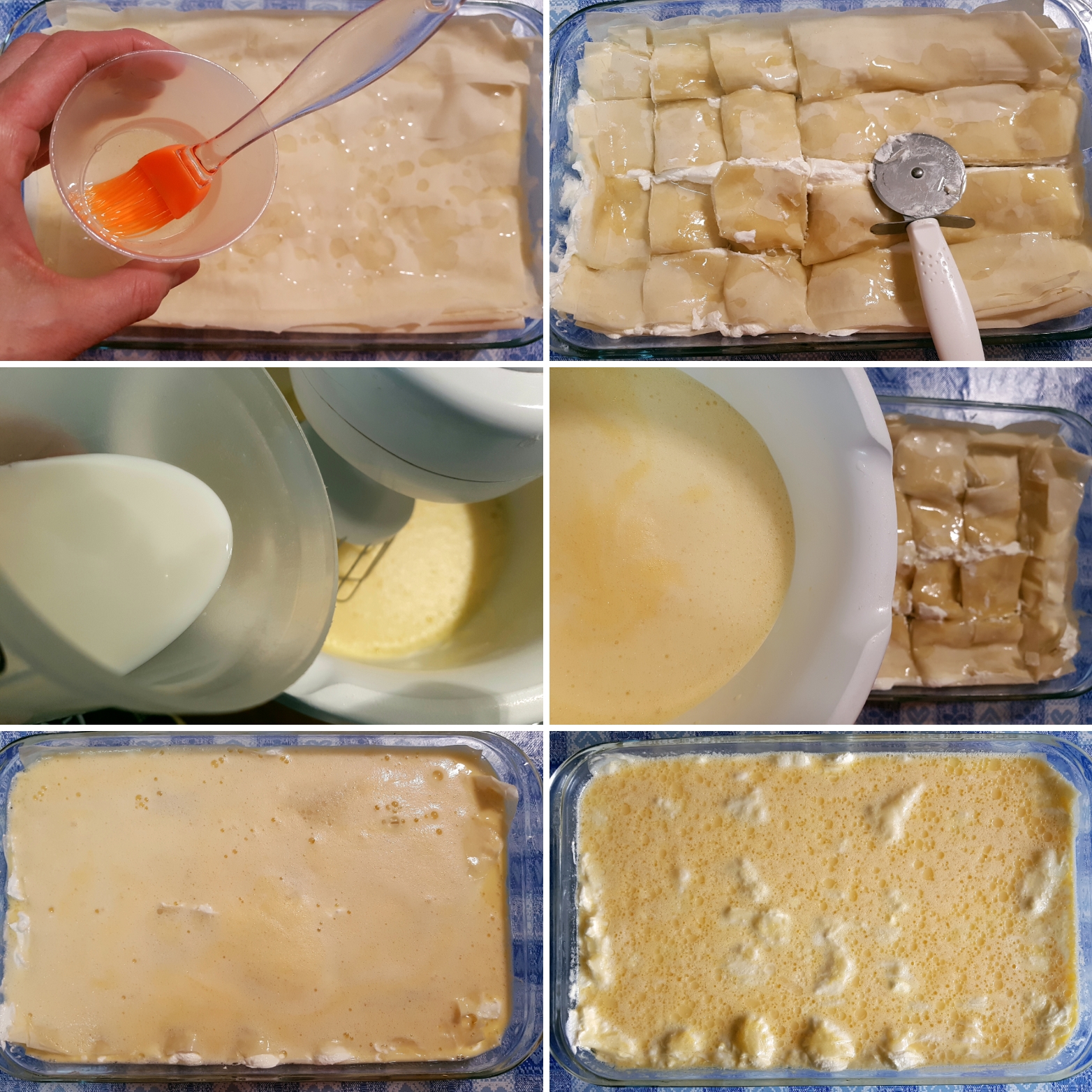 5. Posebno mikserom umutite jaja sa solju, mlekom i kiselom vodom, a potom prelijte preko isečene pite .