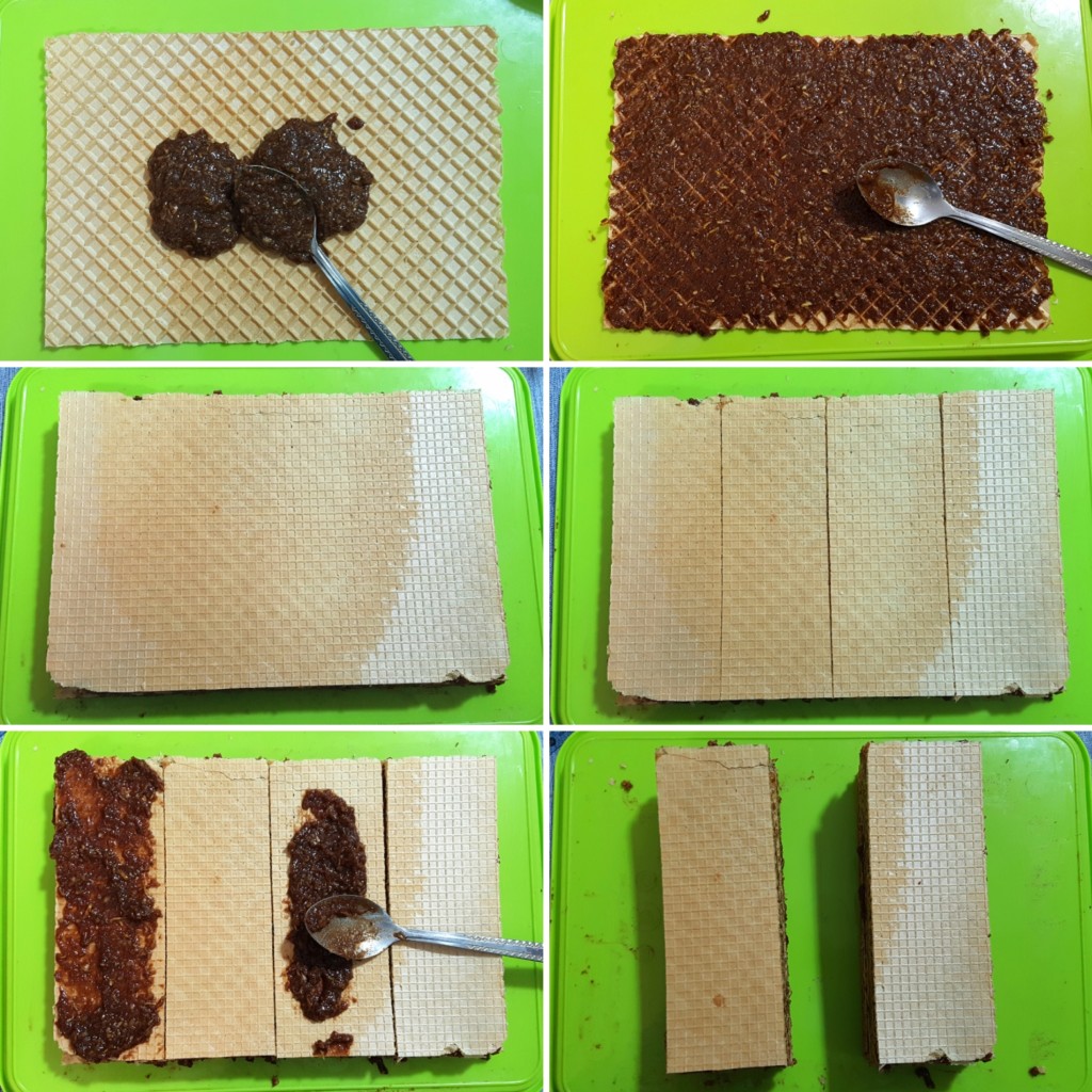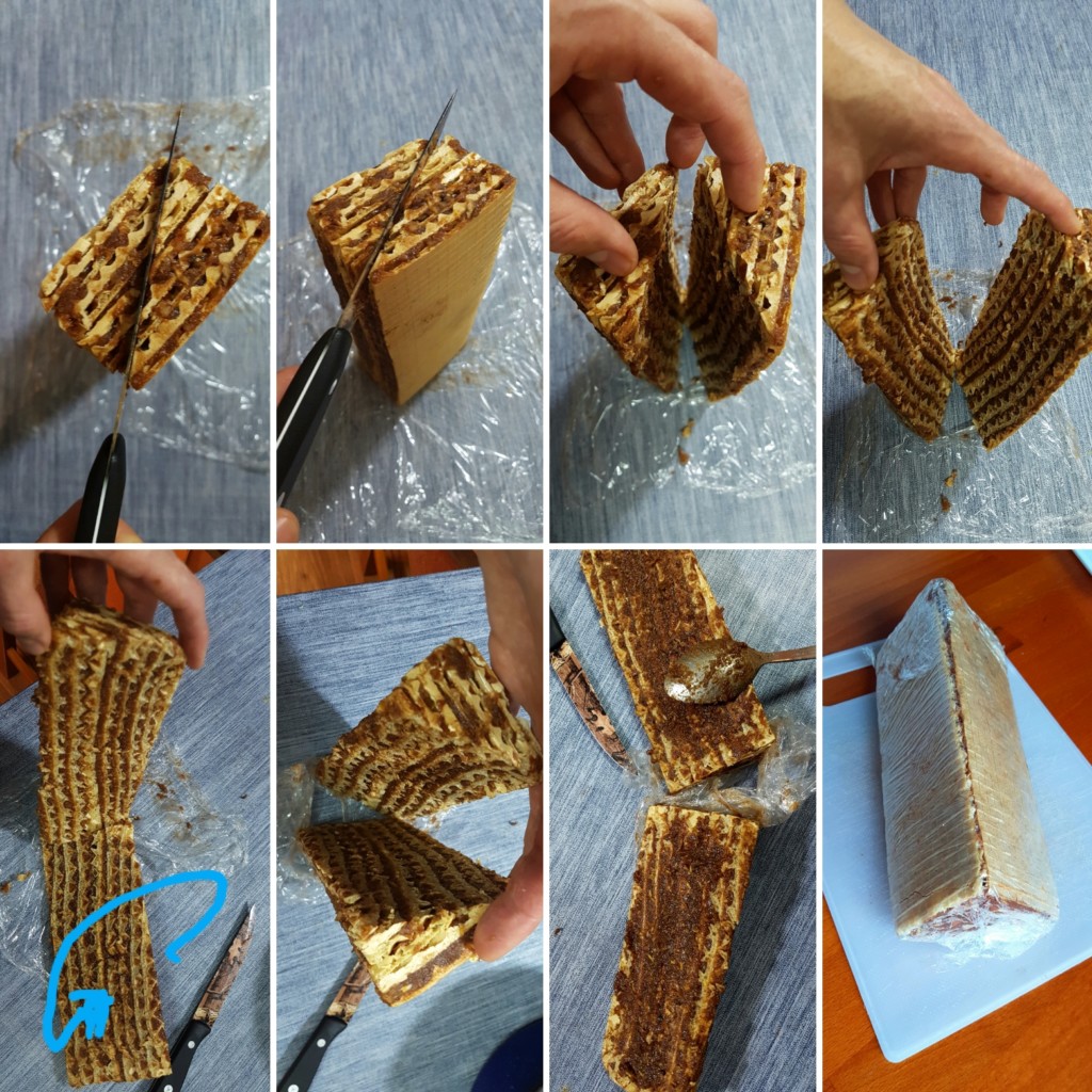 7. Složenu oblandu isecite na četiri lente širine oko 6.5 cm , pa svaku drugu premažite sa po malo fila i spojite po dve ( stavite jednu na drugu), uvijte ih u providnu foliju i stavite u zamrzivač na pola sata.
