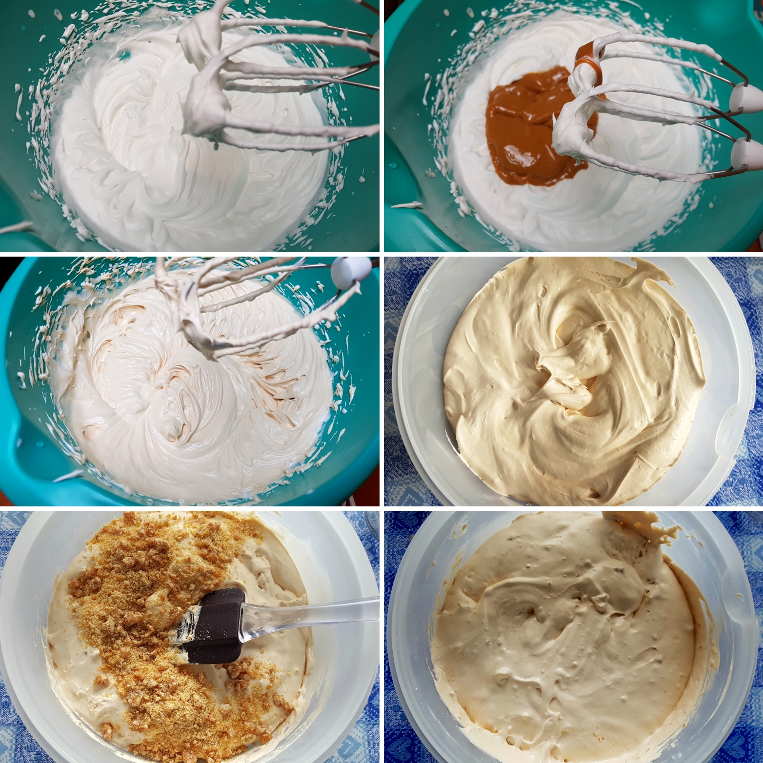 SAVET: Ne previše, kad za mutilicama ostaje trag prekinite miksanje. - Dodajte po malo karamela neprekidno i lagano muteći da se spoje u fin krem.
