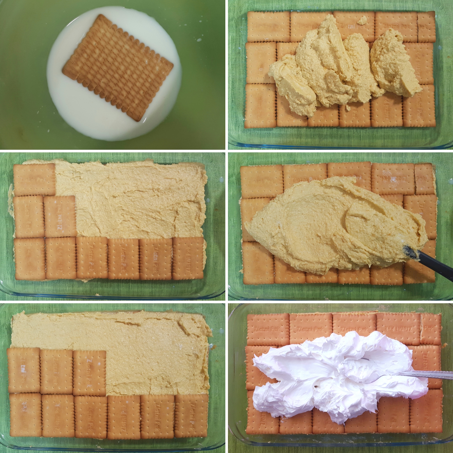 - Dno pravougaone tepsije ili vatrostalnog suda (moj je 20×30 cm) prekrijte redom keksa, koji ste prethodno potopili na kratko u mleko.