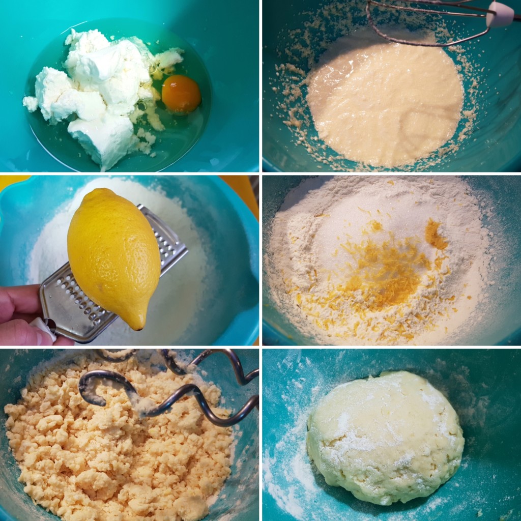 2. Dodajte veći deo brašna pomešanog sa praškom za pecivo, so i rendanu koricu limuna. Promenite nastavke na mikseru i mutite spiralnim dok ne dobijete mrvičastu masu. Dodajte još malo brašna i dovršite mešenje ručno.