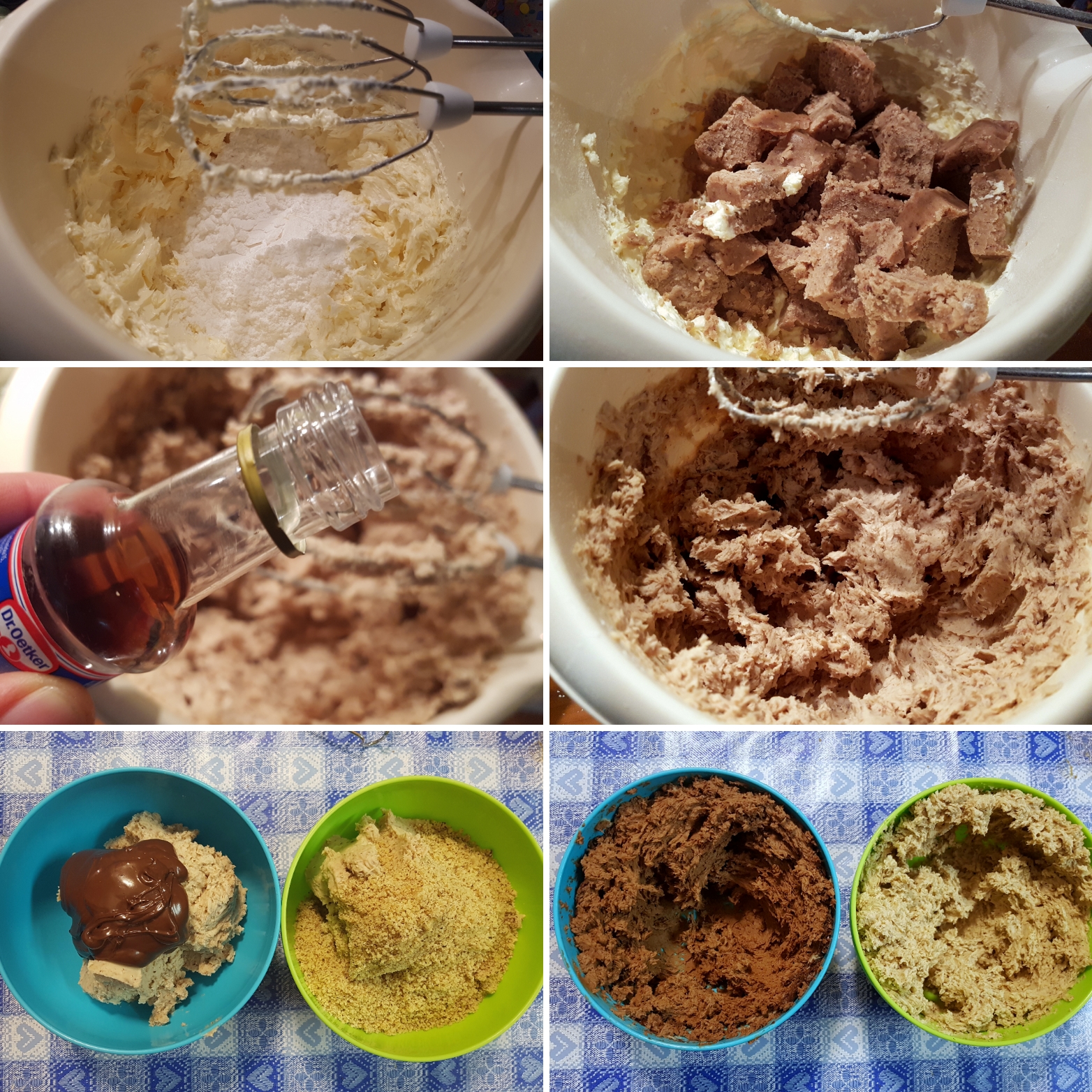 2. Dobijenu smesu podelite na dva dela- u jedan umešajte mlevene orahe, a u drugi prohlađenu otopljenu čokoladu. Svaki deo podelite opet na pola.