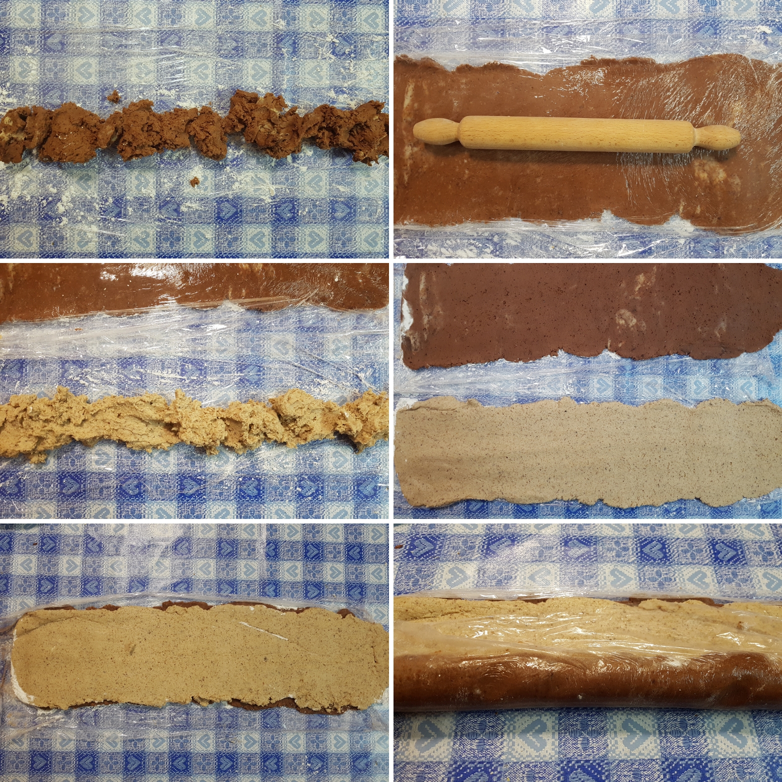 4. Postupak ponovite sa svetlom smesom, a potom skinite gornje folije sa oba dela. Podignite svetli deo i prebacite ga na tamnu smesu, zatim sklonite foliju od gore (koja je bila ispod svetlog dela) i sve zajedno urolajte, pazeći da prilikom rolanja ne uvučete preostalu foliju. Nadam se da ste razumeli, a da biste bili sigurniji pogledajte fotografije pripreme.
