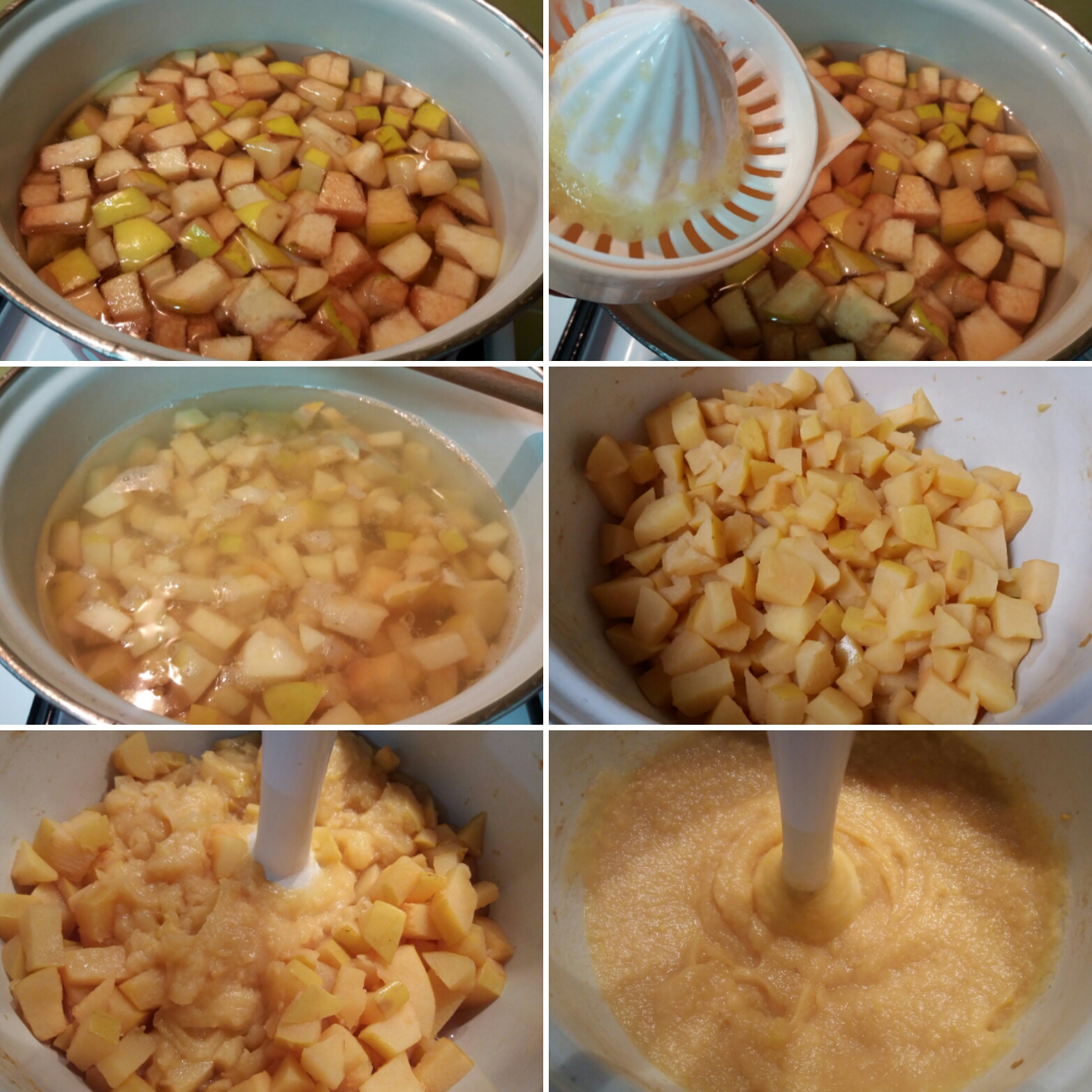 3. Skuvane komadiće dunje ocedite od tečnosti (možete sačuvati tečnost za sok), te izmiksajte štapnim mikserom.