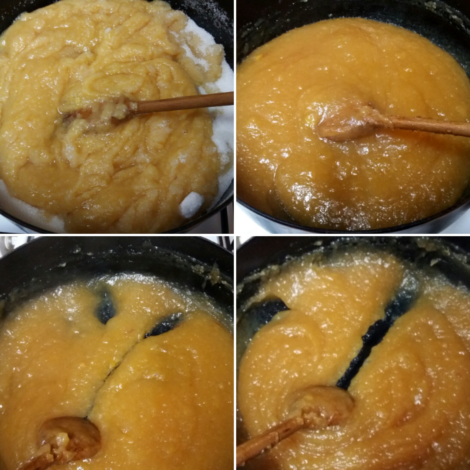 4. Dobijenu masu prespite u veću šerpu , dodajte šećer i kuvajte uz mešanje dok za varjačom ne bude ostajao jasan i trajan trag. Smesa treba da je znatno gušća nego pekmez. Ako želite pred kraj možete umešati seckane orahe.