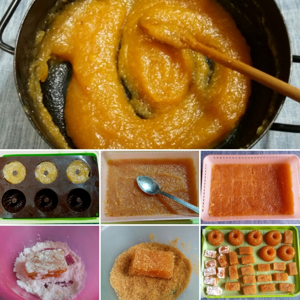 5. Silikonske modle ili starinske limene kalupe ili obične plehove /tepsije navlažite ( isperite samo) hladnom vodom, rasporedite smesu i poravnajte. Ostavite na hladnom mestu ( ne u frižider) da se ohladi i stegne, a zatim istresite iz kalupa/modli. Deo iz pleha/tepsije isecite na komade, pa ih po želji možete uvaljati u kristale smeđeg šećera ili šećer u prahu. Na papirom za pečenje postavljenim tacnama ostavite sve da se prosuši još nekoliko dana.