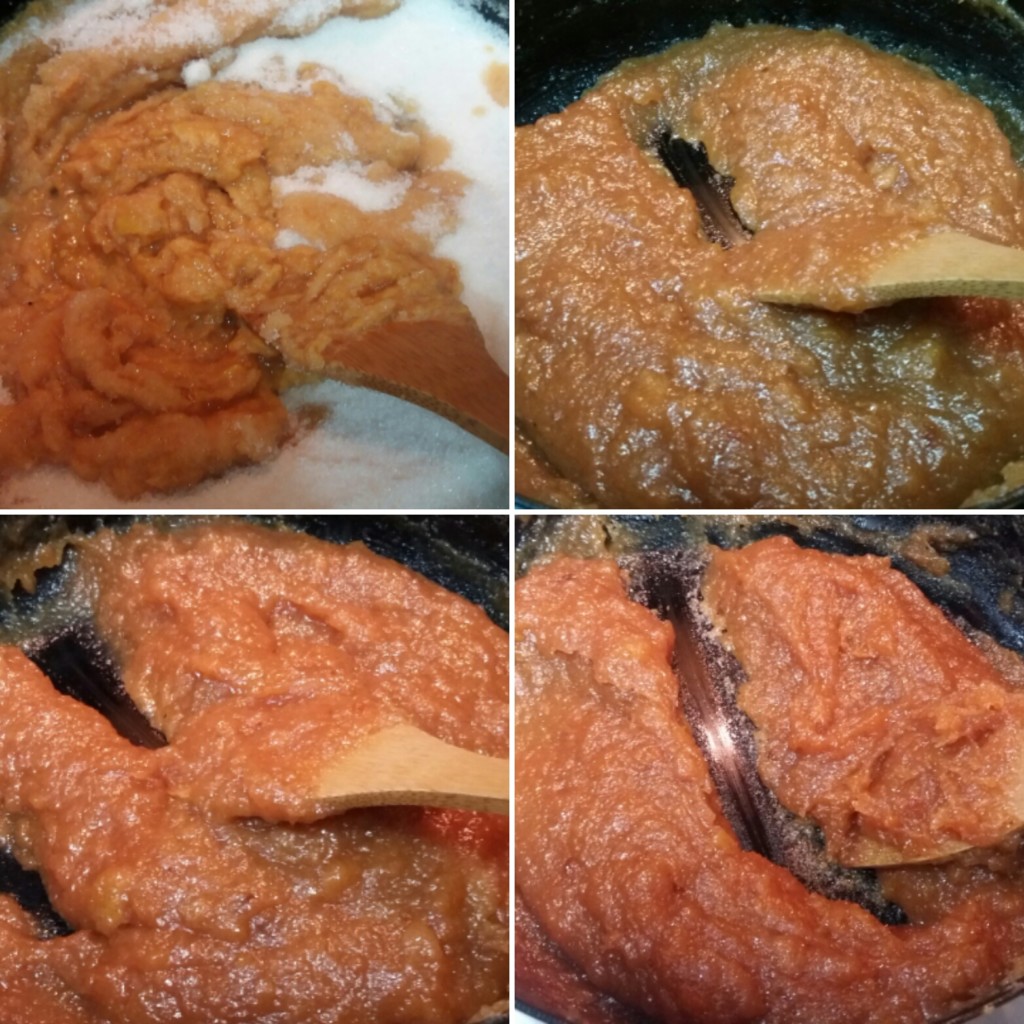 2. Proceđenu masu sam izmiksala štapnim mikserom i na kilogram voćnog pirea dodala 800 g šećera kao i prošlog puta. E sad je došao deo gde sam mešala i mešala i mešala dva i po sata s namerom da opovrgnem i tezu o lenjosti kao mogućem uzroku neuspeha. Al, avaj, osim bola u ramenu boja se neznatno menjala ka tamnijem spektru narandžastog, al je zato gustina dostigla nivo gde je varjača stajala uspravno zabodena u masu kao mač u kamenu.
