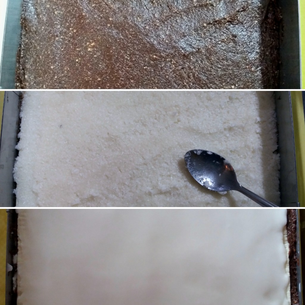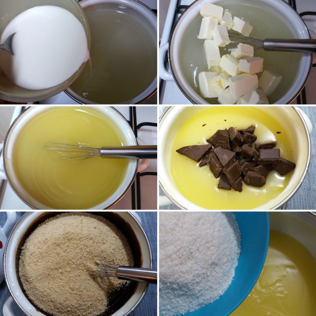 2. Dodajte komade margarina da se rastope, a potom podelite smesu ne dva nejednaka dela ( otpr. 3:2).U veći deo umešajte kockice čokolade i kad se otope dodajte mleveni keks, a u manji deo kokos.