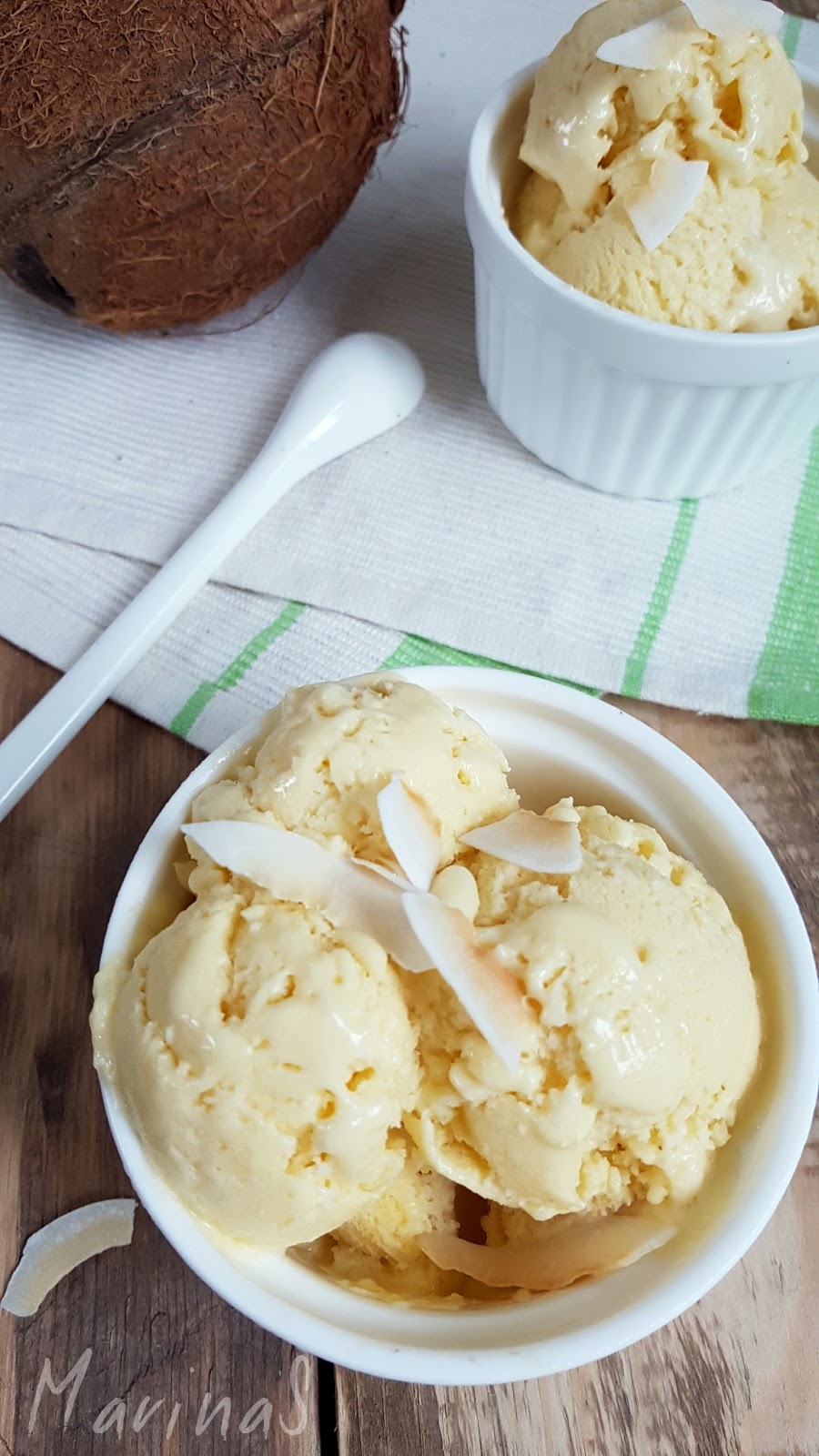 Ako volite ukus kokosa ova je ledena poslastica po vašem ukusu. Našla sam bila recept na mađarskom sajtu Dívány, pa sam ga malčice izmenila i dopao mi se rezultat. Sledeći put ću umešati i komadiće čokolade radi totalnog bounty šmeka, al je i ovakav kokos sladoled fino kremast i sasvim sigurno osvežava.