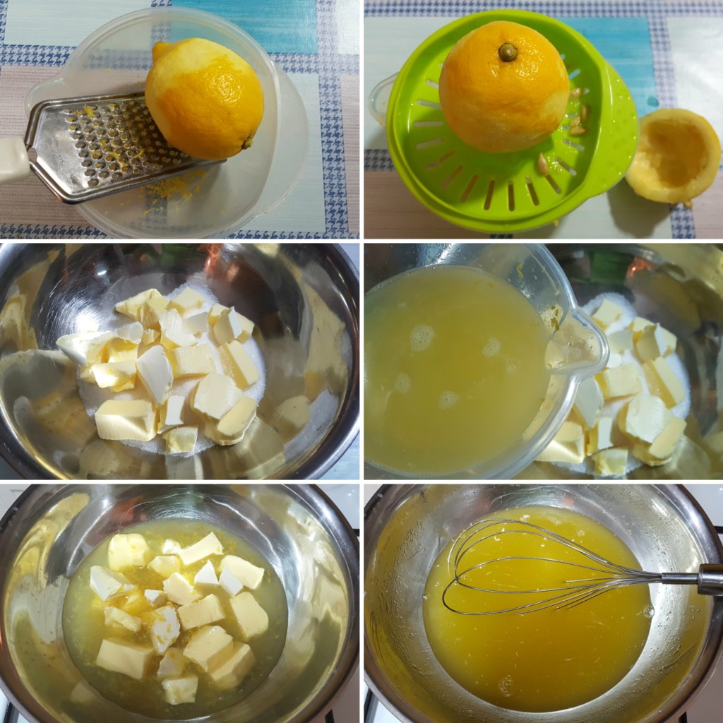 1. Narendajte sitno koricu od jednog dobro opranog limuna. Iscedite sok od sva tri limuna, dodajte šećer i puter i zagrevajte u sudu nad parom dok se ne rastope.
