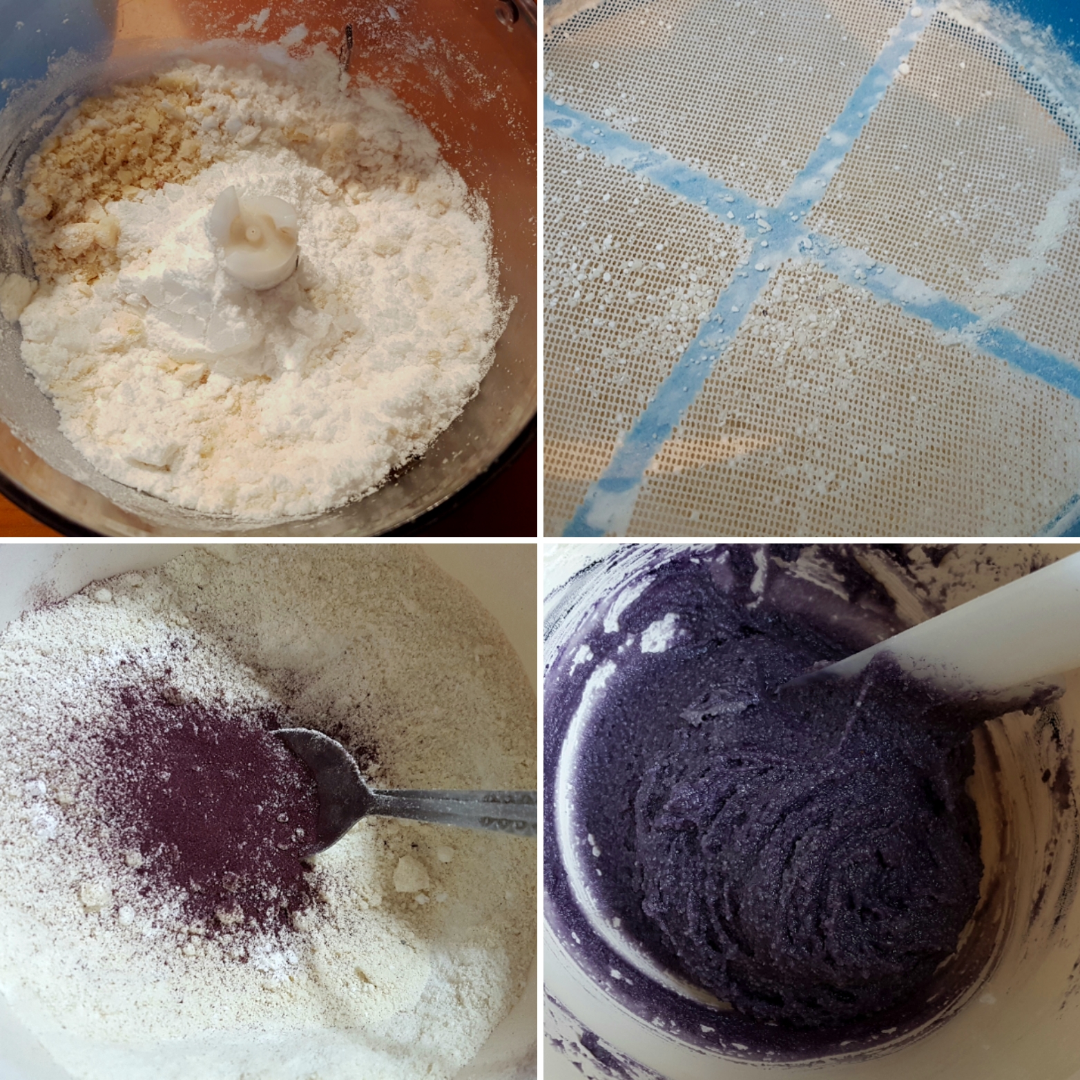 3. Mešavini mlevenih badema i šećera dodajte 50 g belanaca i boju po želji, pa špatulom mešajte dok ne dobijete pastu. Stavite više boje jer će tokom pečenja malo izbledeti.Odložite.