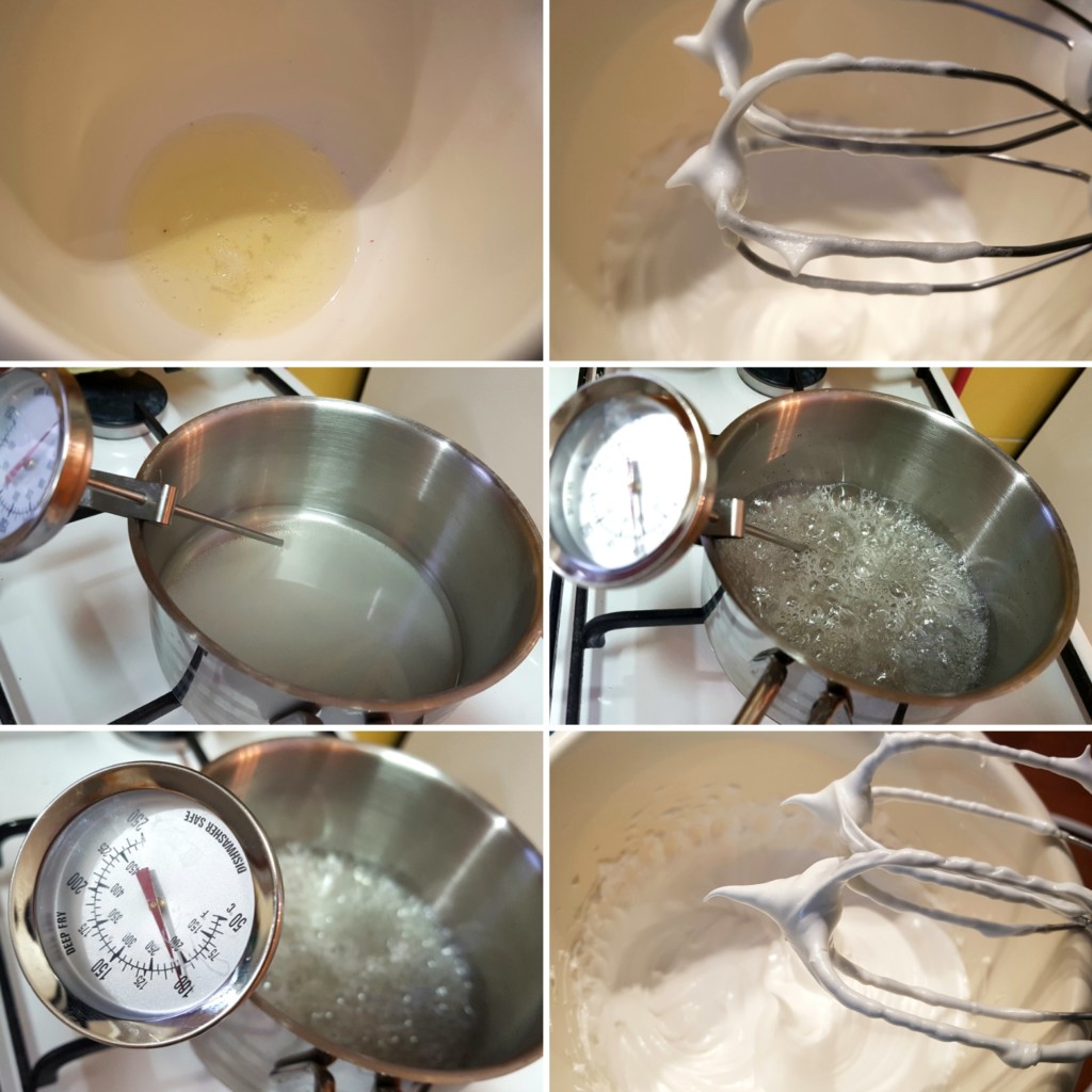 6. U međuvremenu mutite belanca sa solju do tačke kad na odignutoj mutilici ugledate tzv. “meke vrhove”. Vreo sirup sipajte u tankom mlazu i sve vreme miksajte srednjom brzinom. Pazite da sirup ne padne direktno na zidove posude ili žice mutilice.