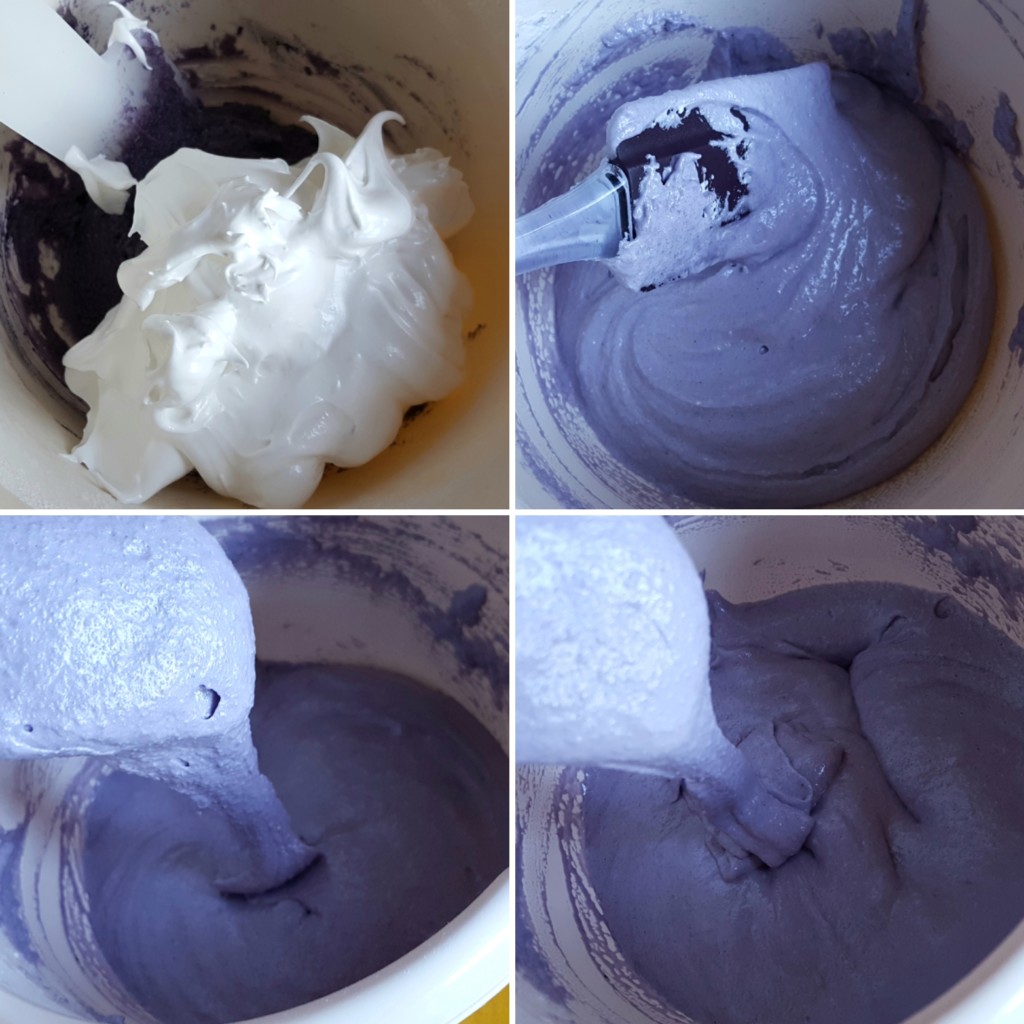 8. Pripremljeni šam dodajte u posudu sa pastom od badema , najbolje u dva navrata, pa špatulom obavite čuvenu “makaronizaciju” – mešajte u krug, od dole ka gore i pritiskajte da izađe što više vazduha i da masa pada poput lave kad podignete špatulu.