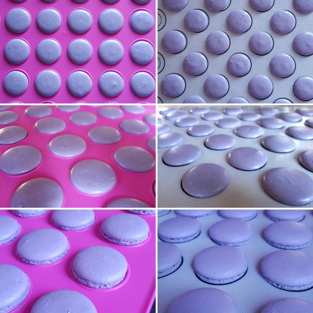 NAPOMENA: Ako pleh nije ravan macaronsi će biti krivi na jednu stranu, a neki čak neće ni uspeti da razviju stopalo. Koristila sam dve vrste silikonskih podloga ,ravne i sa udubljenjima. Prednost ravnih je što se macaronsi brže ispeku i lakše odvajaju, a onih sa udubljenjima je što ćete lakše dobiti macaronse iste veličine.