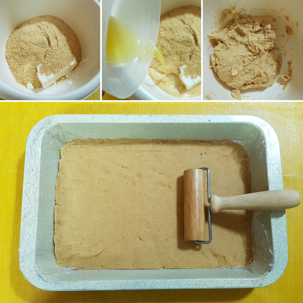 2. Pripremljenu masu rasporedite u providnom folijom obloženu pravougaonu tepsiju (moja je 20×30 cm) i utapkajte prstima.