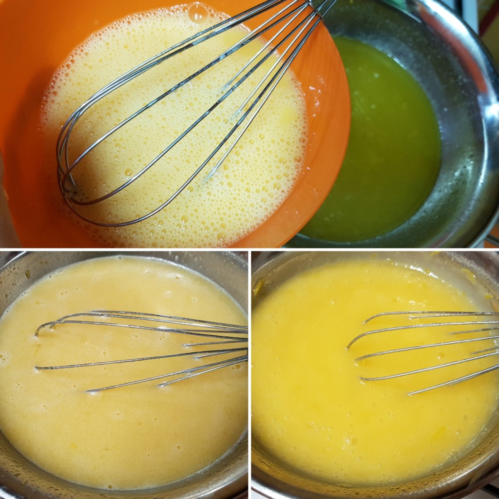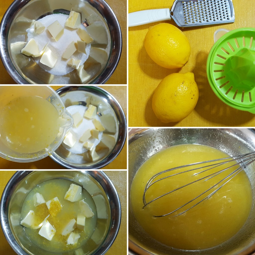 1. Dva limuna dobro operite, pa koricu naribajte, a sok iscedite. Dodajte im puter i šećer, te sve zajedno zagrevajte u sudu nad parom dok se šećer i puter ne rastope. Ostavite da se prohladi.